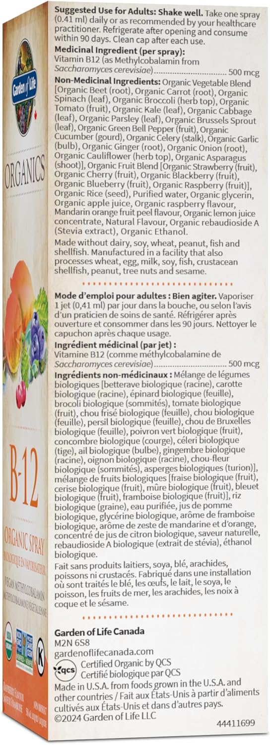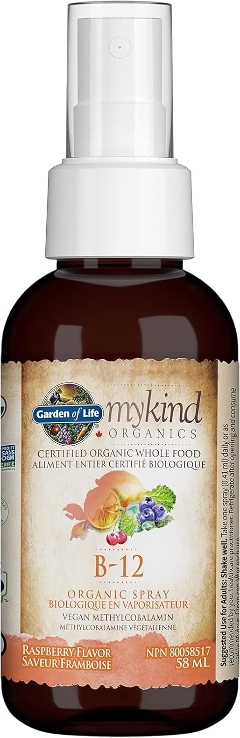 生命花園有機維生素B-12噴霧,覆盆子口味 | 支持免疫系統、能量、新陳代謝和健康血細胞 | 全食物成分,非基因,無麩質,純素,猶太潔食認證