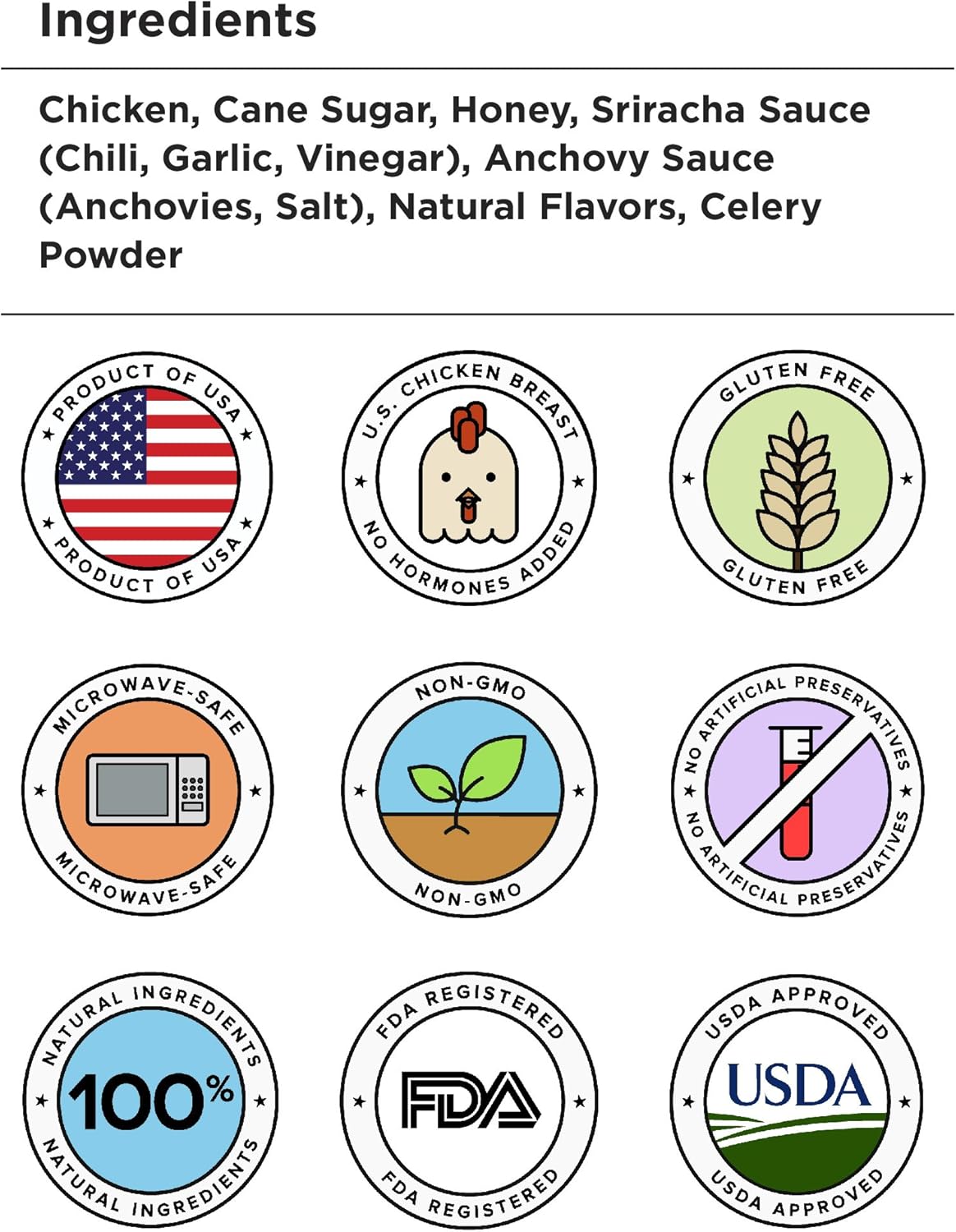 全天然、健康零食:全天然成分,高蛋白、低脂肪、低碳水化合物、低卡路里、不含味精、不含防腐劑、不含硝酸鹽、不含麩質、低糖含量、優質全肌肉 USDA 認證的美國飼養無激素雞肉。營養豐富:9 克蛋白質讓您保持飽腹感、專注力和精力充沛,同時滿足您對多汁美味肉乾的渴望。多汁燒烤口味:獨特的明火燒烤和釉料工藝,顯著減少不良脂肪含量,同時鎖住天然肉汁,讓每一口都最大限度地發揮風味。高蛋白、低脂肪零食:為您提供補充肌肉和最大限度提高運動效果所需的蛋白質和能量。深受運動員、健美運動員、CrossFit、拳擊、游泳、網球、足球、橄欖球、籃球、棒球和所有其他運動愛好者的喜愛。
