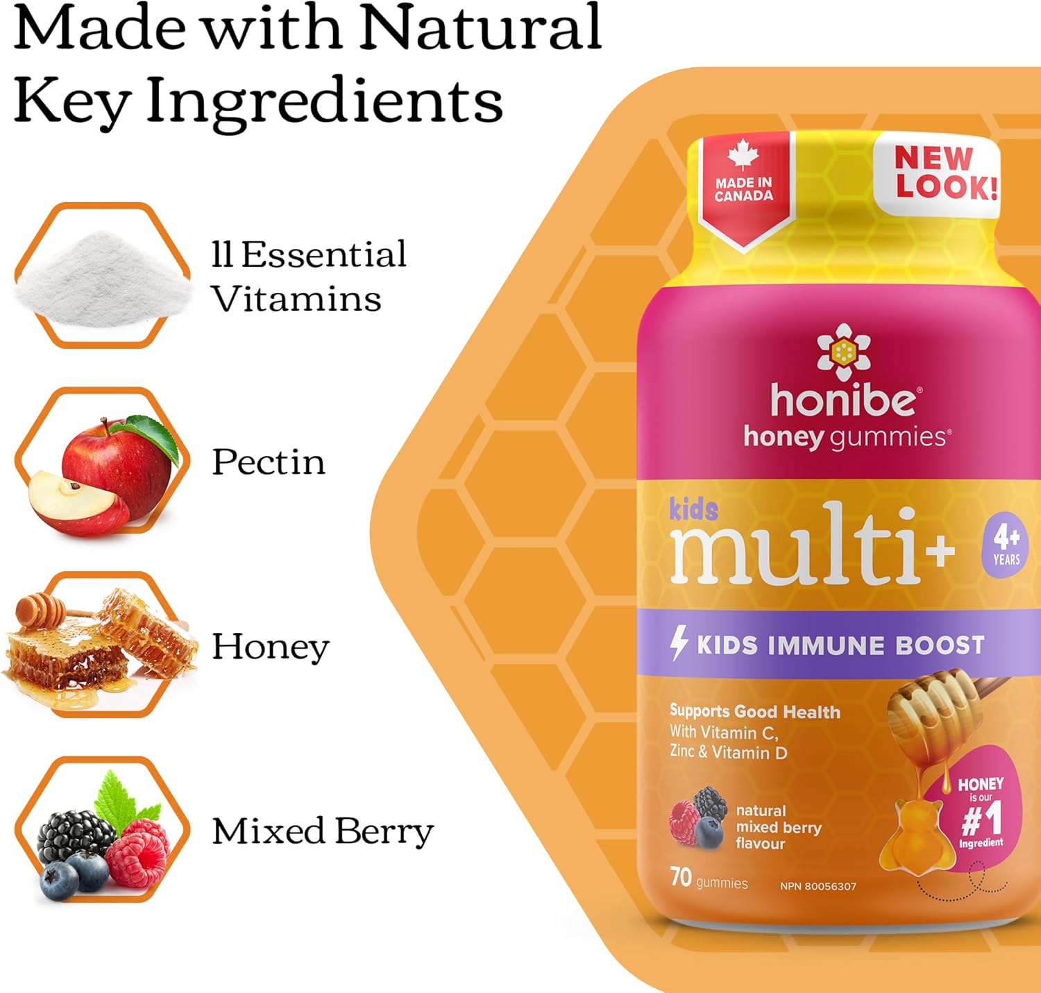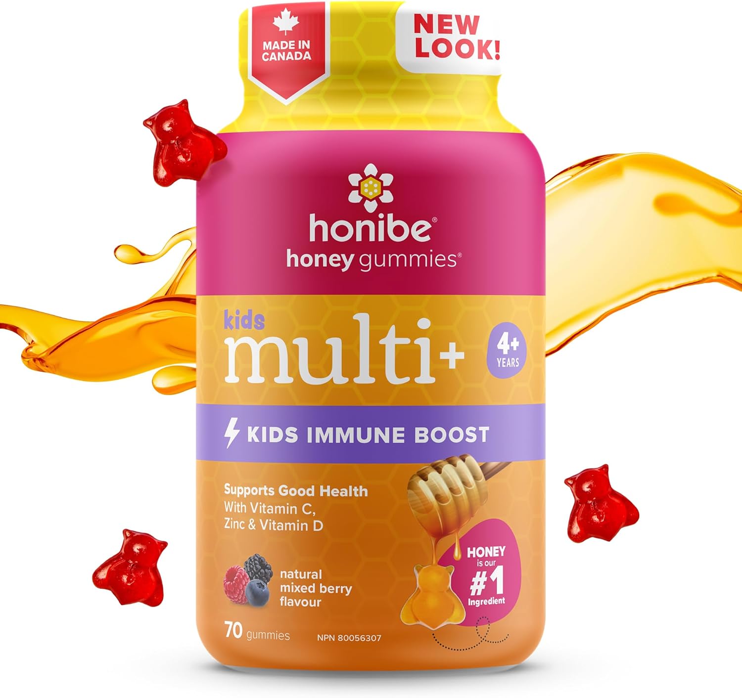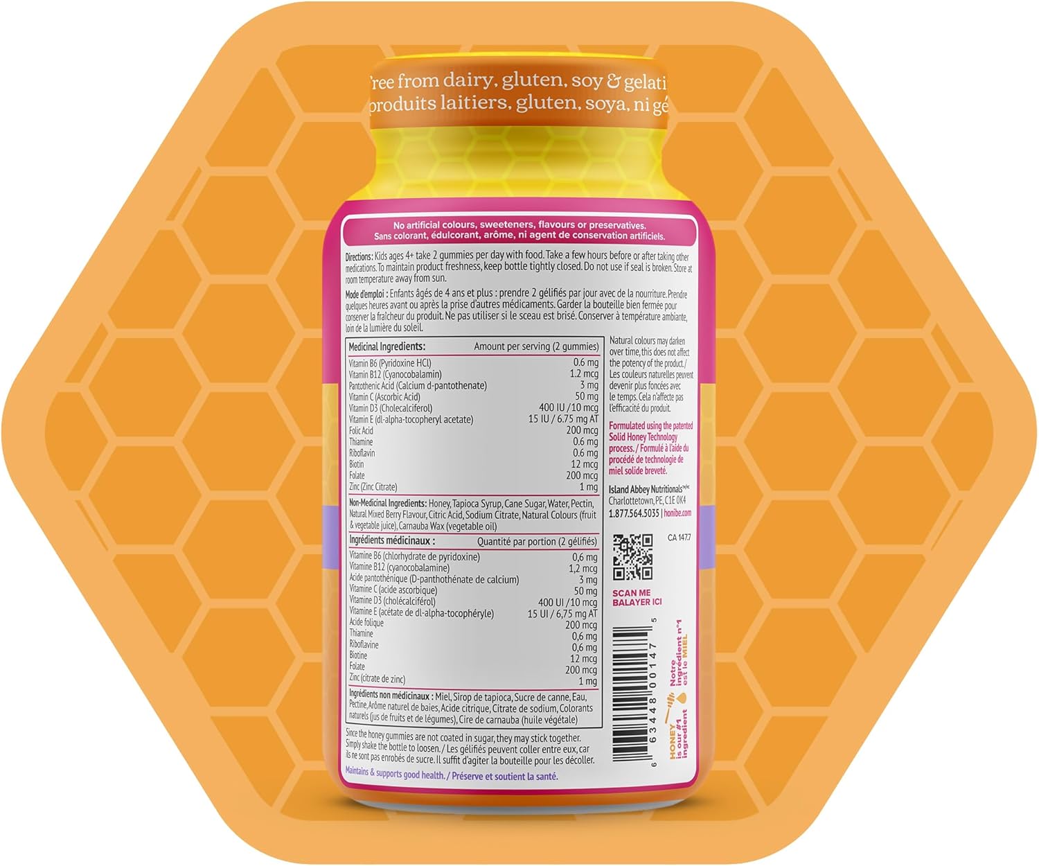 Honibe 兒童複合維生素軟糖,增強免疫力 | 加拿大製造蜂蜜維生素 | 兒童咀嚼軟糖維生素 | 兒童素食維生素軟糖 | 兒童鋅維生素小蜜蜂軟糖 | 70 粒軟糖