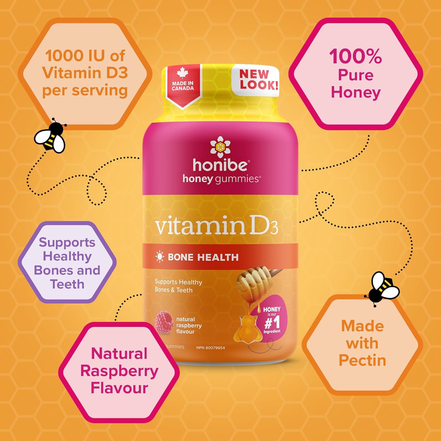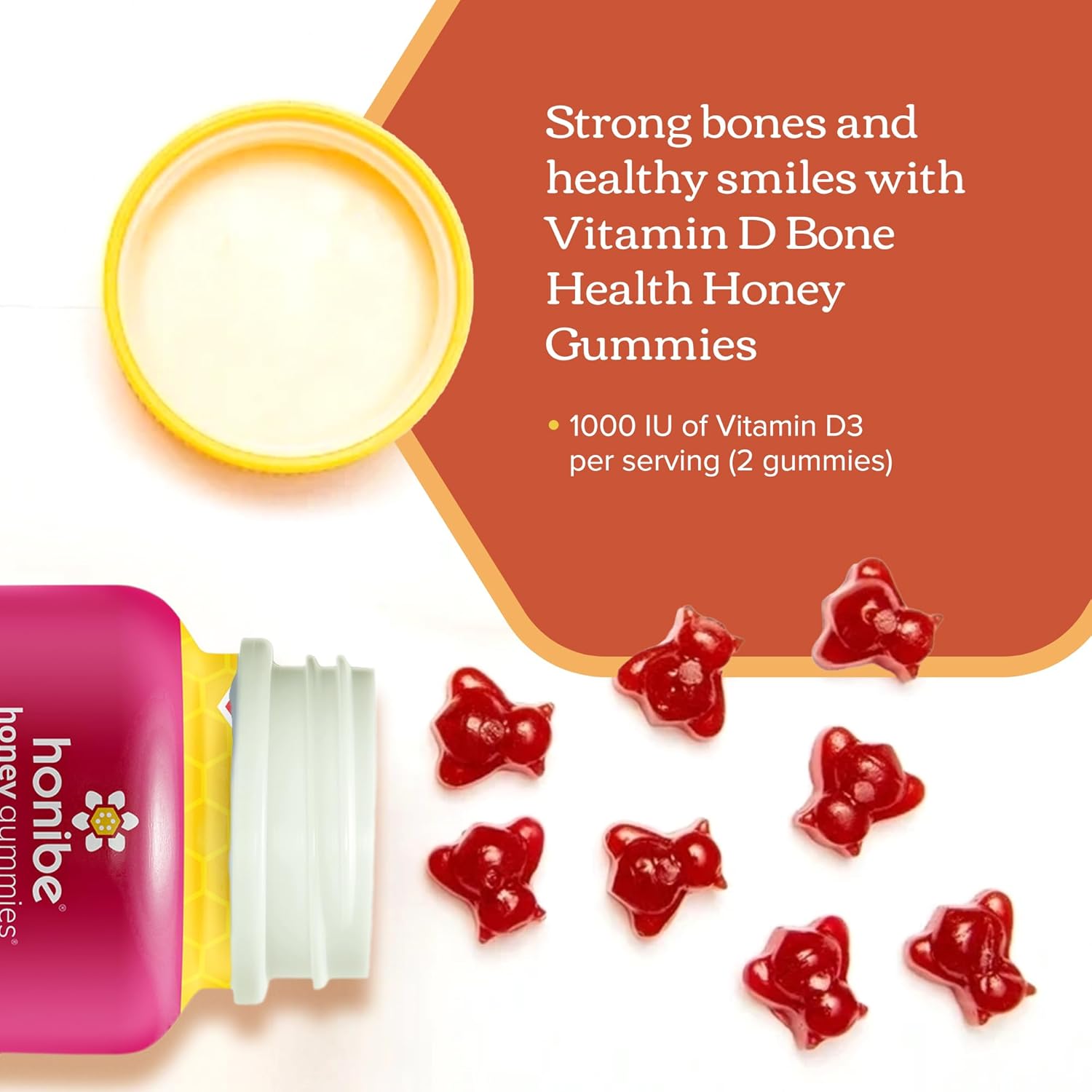 Honibe 維生素 D 軟糖,適合兒童和成人 | 加拿大製造的蜂蜜維生素 | 維生素 D3 有助於支持骨骼健康、情緒和免疫系統功能 | 素食咀嚼維生素 D 補充劑 | 70 粒軟糖