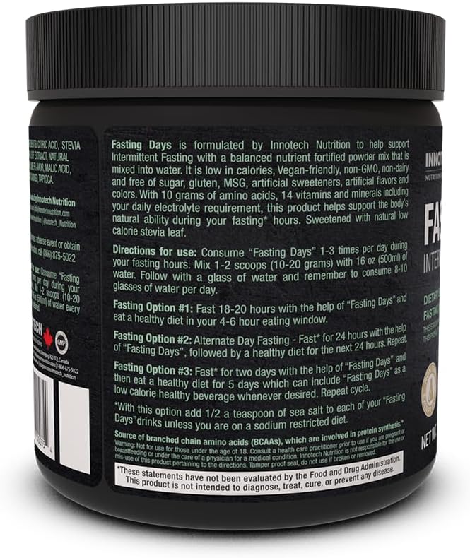 這款均衡營養強化粉劑可與水混合,支持間歇性斷食。低卡路里、非基因改造、非乳製品,不含糖、麩質、味精、人工甜味劑、人工香料和色素。本品含有10克氨基酸、13種維生素和礦物質,包括每日所需的電解質,有助於在禁食期間維持身體的自然能力。