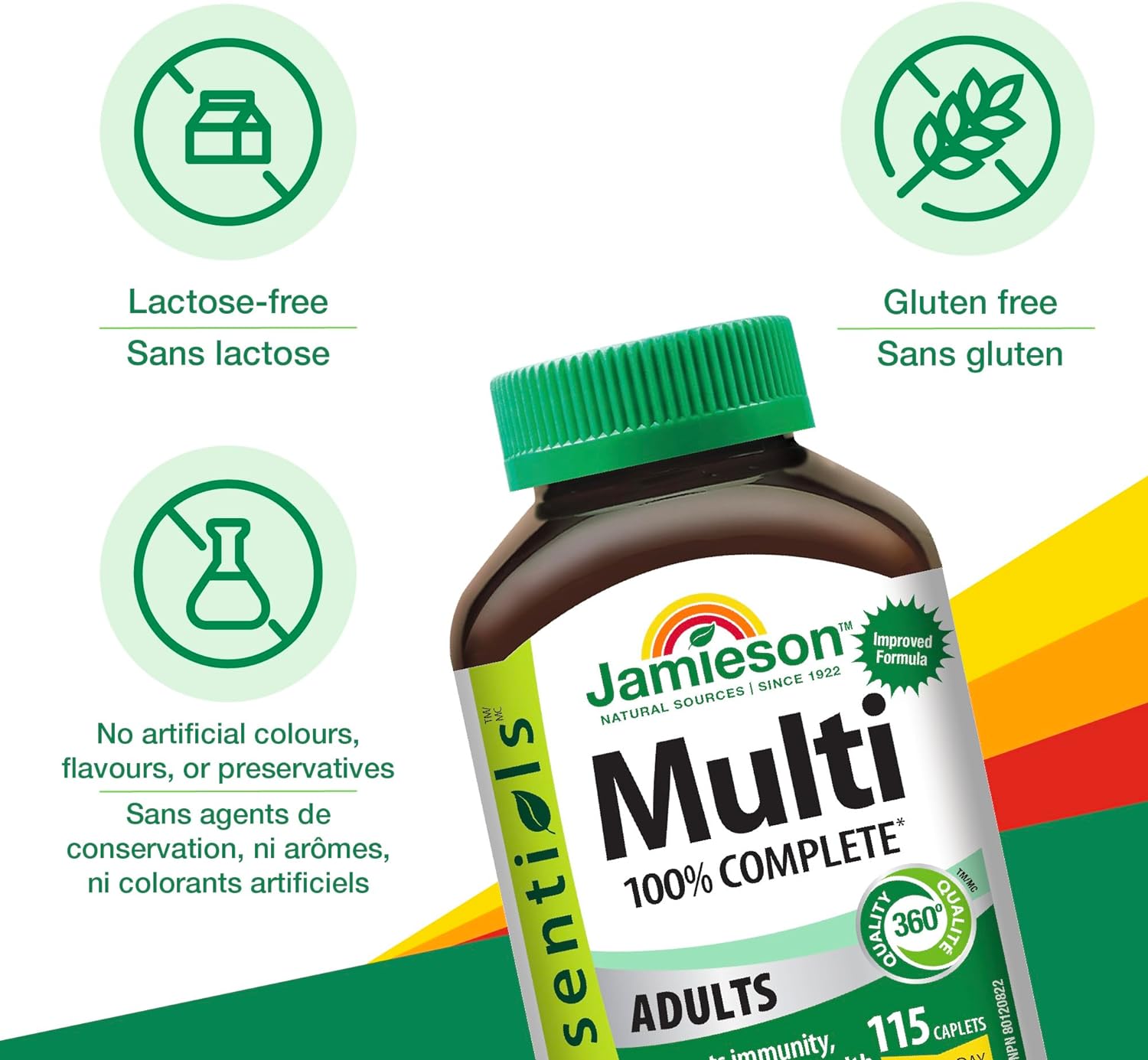 Jamieson 100% 成人複合維生素,含葉黃素、鈣和生物素。支持免疫力、能量和整體健康,富含抗氧化劑,無麩質,每日一片,115 粒膠囊