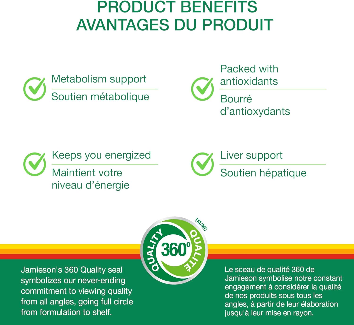 Jamieson 100% 成人複合維生素,輕鬆滿足您每日 100% 的身體所需維生素。本產品符合加拿大衛生部的建議配方,讓您安心無虞,每日攝取 100% 甚至更高的維生素!