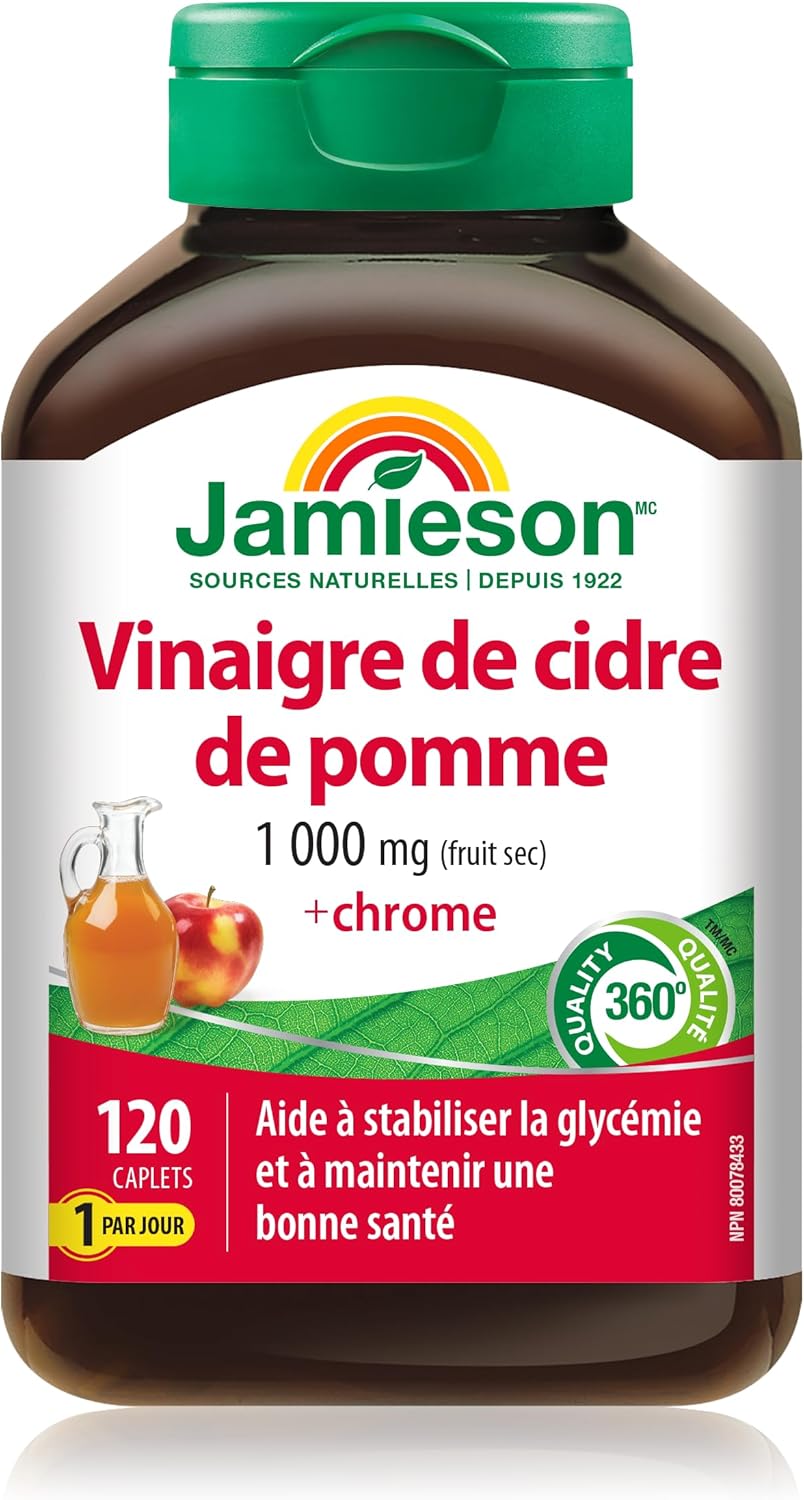 Jamieson 蘋果醋含鉻膠囊,有助於維持正常血糖水平並促進新陳代謝。每日一片,素食,非基因改造,無麩質,120 粒