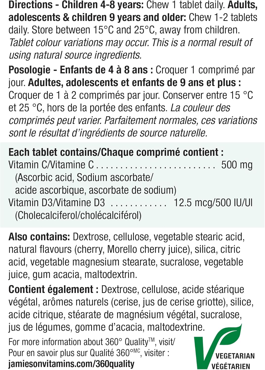 Jamieson 咀嚼維生素C 500毫克,含維生素D 500國際單位,酸櫻桃口味,適合4歲以上兒童,有助於增強免疫力,強健牙齒和骨骼。素食,無麩質,不含人工香料和色素,75粒,配方…
