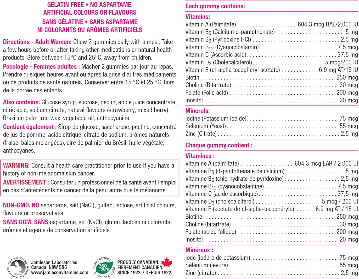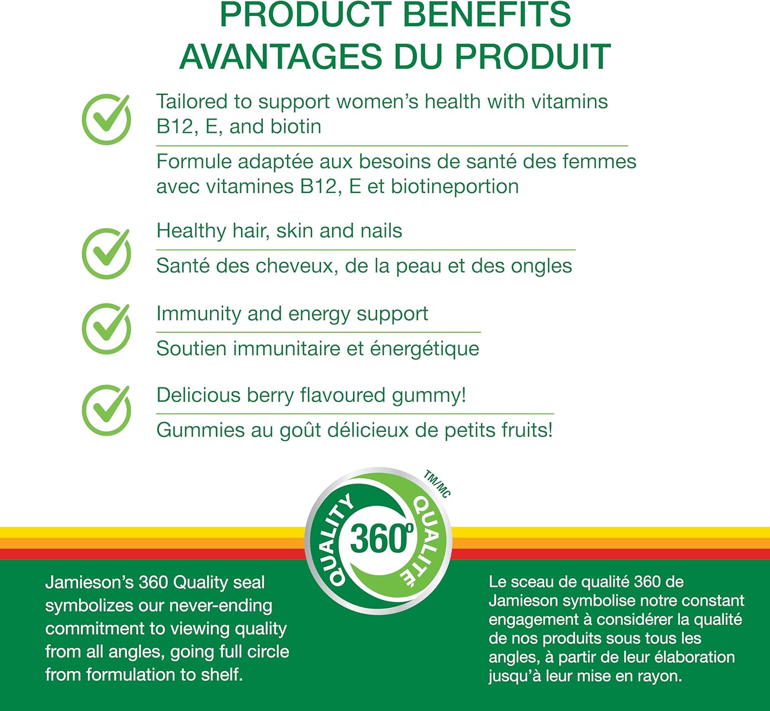 Jamieson 女士複合維生素軟糖,混合莓果口味,有助於骨骼健康、免疫力、能量、頭髮、皮膚和指甲健康。加入生物素和維生素B12,素食,非基因,不含麩質、人工色素、香精或防腐劑…