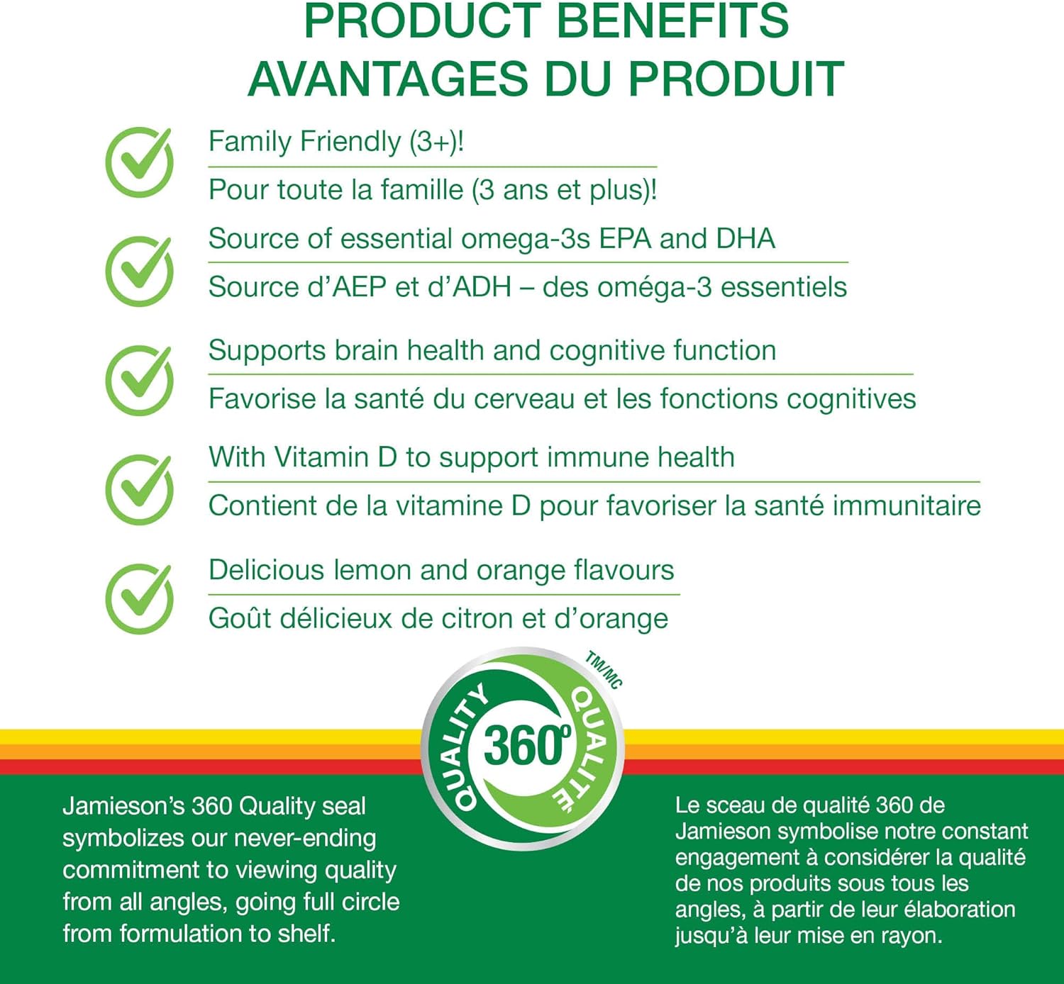 Jamieson Omega-3 維生素D3軟糖,柳橙和檸檬口味,適合3歲以上家庭食用。支持大腦健康和免疫健康,無麩質、非基因,不含人工色素、香精或防腐劑,90粒裝