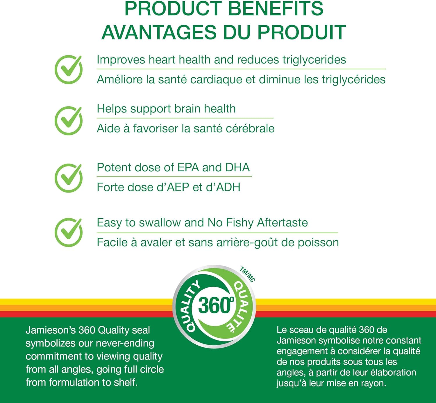 Jamieson 無魚腥味 Omega-3 350 毫克是一款強效 Omega-3 魚油補充劑,採用易於吞嚥的迷你軟膠囊包裝。 Omega-3 魚油有助於促進心臟健康並降低膽固醇。此外,這款補充劑的配方無魚腥味,也不會引起反胃。本產品經藥物測試,保證不含汞和鉛等重金屬。
