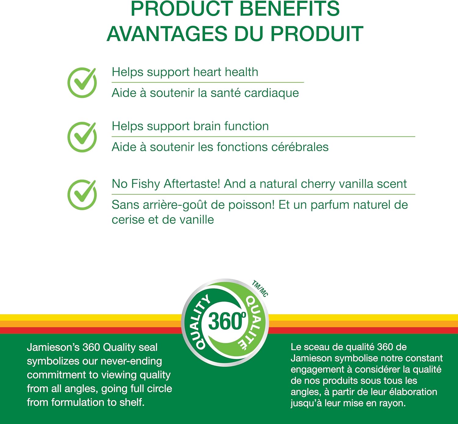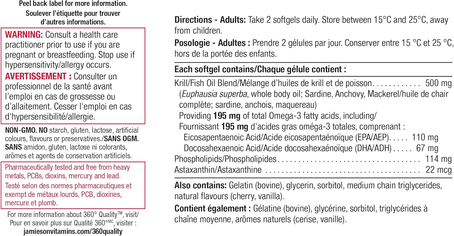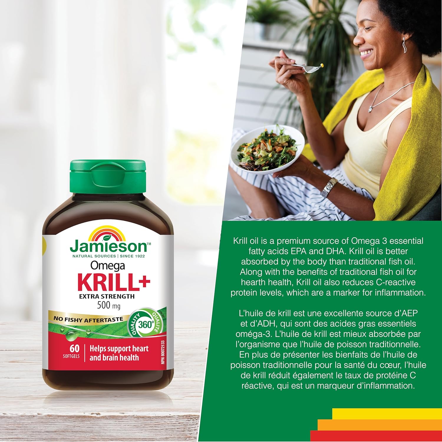 Jamieson Omega Krill Plus 500毫克軟膠囊,無魚腥味,富含EPA、DHA、磷脂質和蝦紅素。支持心臟健康和大腦健康,非基因改造,無麩質,60粒,加拿大製造