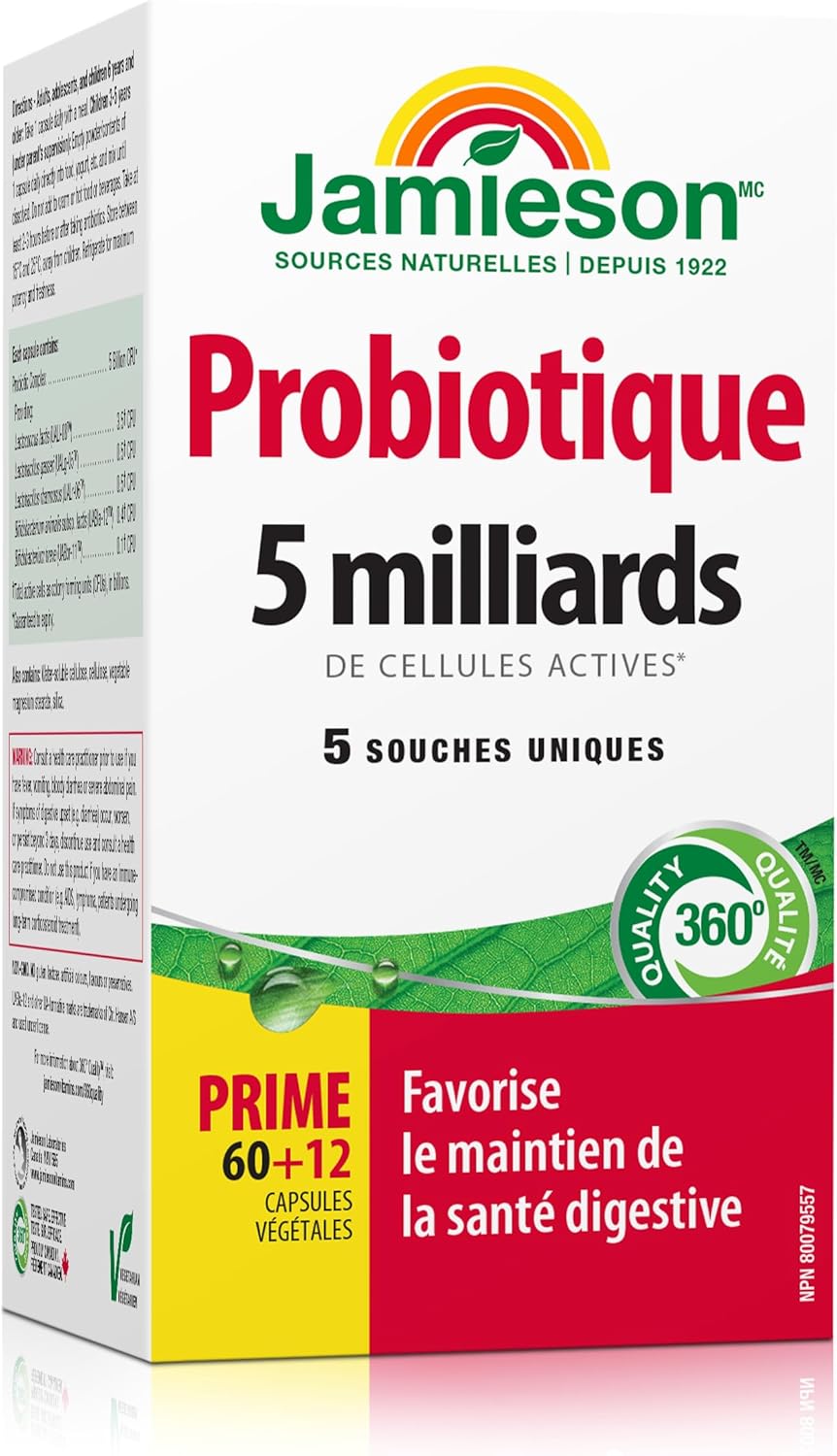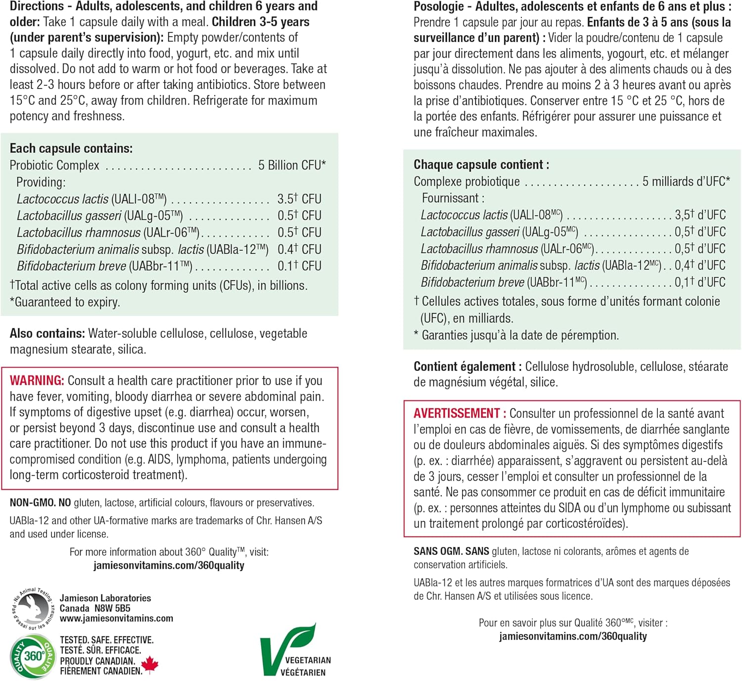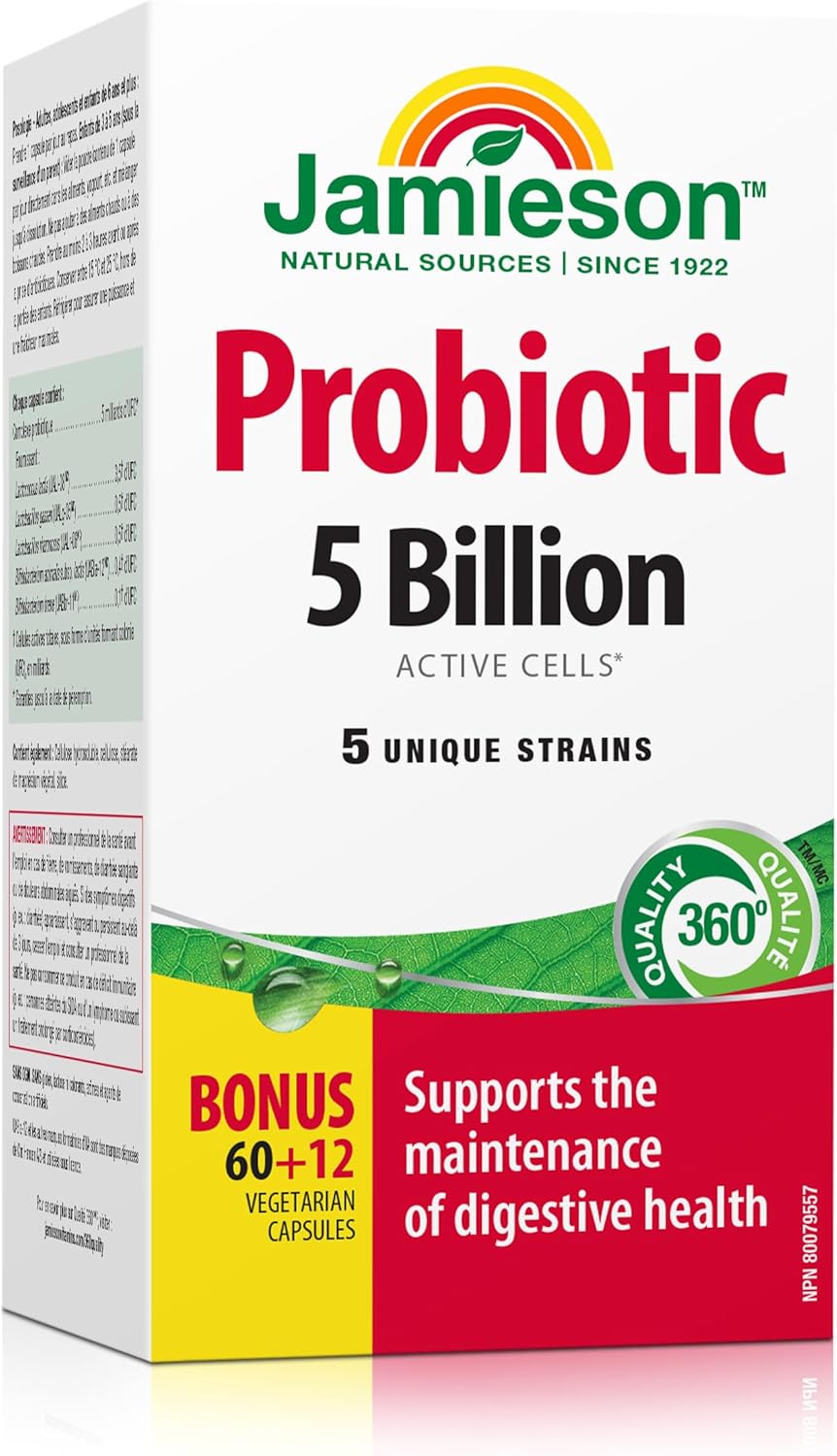 Jamieson 益生菌 50 億活性細胞,加量裝,支持消化系統健康和微生物多樣性。 5 種獨特菌株,包括乳酸桿菌和雙歧桿菌,非基因改造,無麩質,72 粒素食膠囊