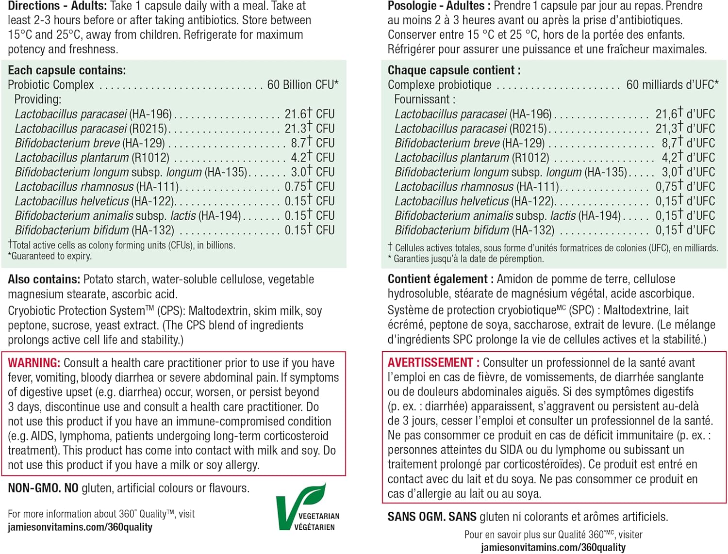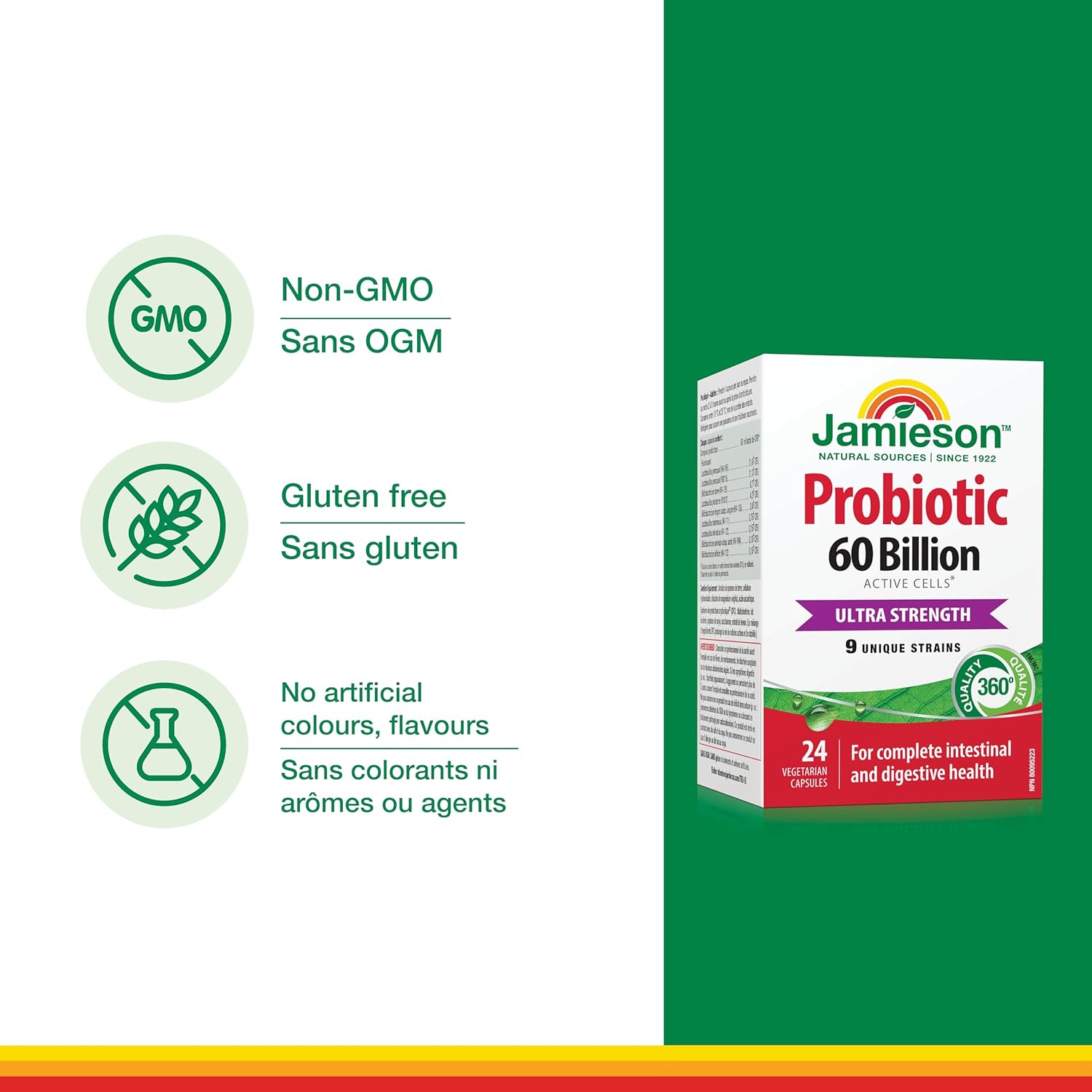 Jamieson 益生菌 600 億活性細胞,超強效,支持消化系統健康和腸道健康。 9 種獨特菌株,包括乳酸桿菌和雙歧桿菌,非基因改造,無麩質,24 粒素食膠囊