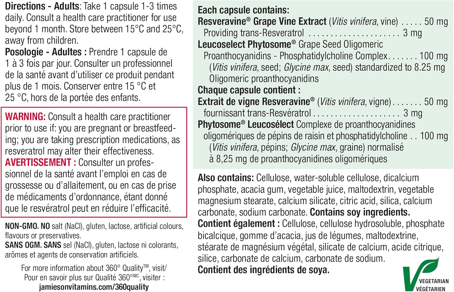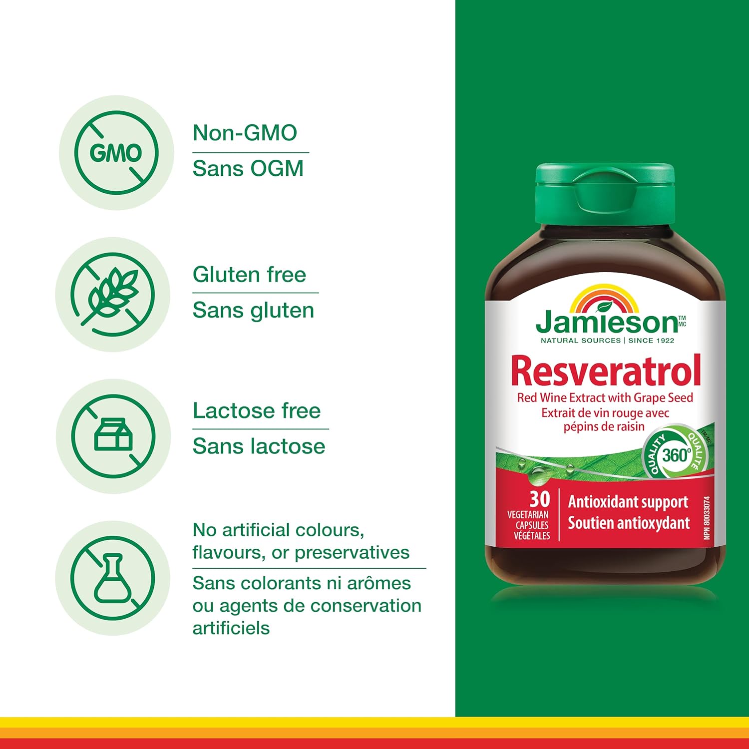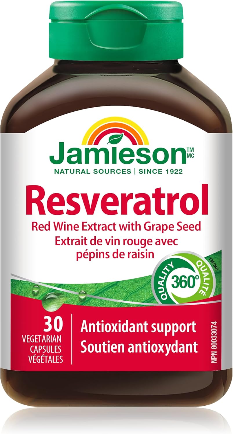 Jamieson 白藜蘆醇、葡萄籽、反式白藜蘆醇,強效抗氧化,支持心血管健康。非基因改造,無麩質,30粒素食膠囊,加拿大製造