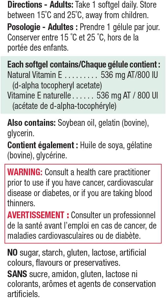 Jamieson 維生素 E 800 IU 富含抗氧化劑。維生素 E 有助於保護組織免受損傷,同時促進正常的紅血球生成。