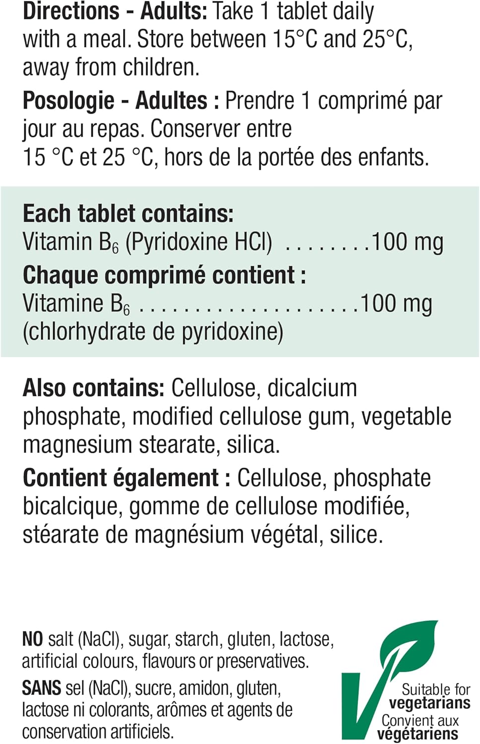 Jamieson 維生素 B6 100 毫克,鹽酸吡哆醇,有助於預防維生素 B6 缺乏症,促進能量生成和代謝。素食,非基因改造,無麩質,100 片裝,加拿大製造
