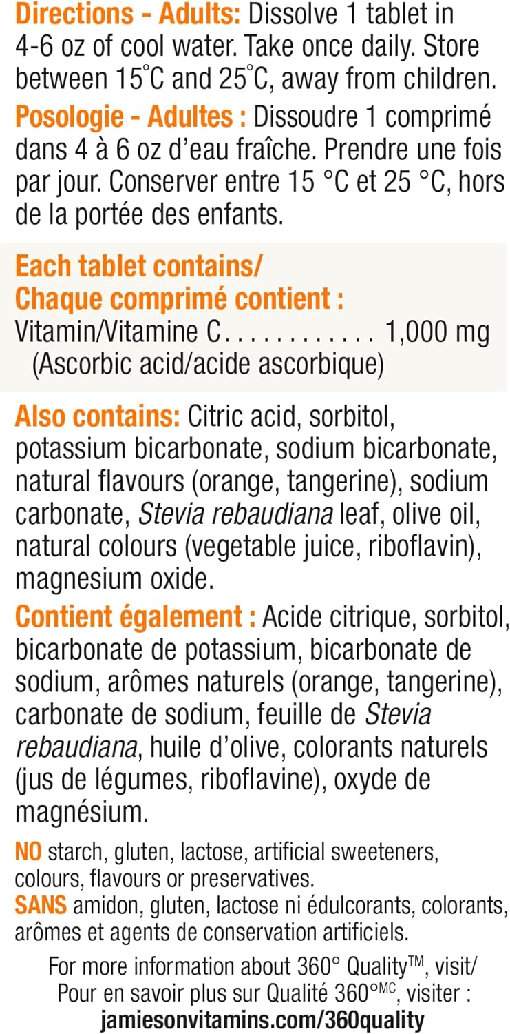 Jamieson 維生素 C 1000 毫克泡騰片,天然橙味,有助於增強免疫力,強健牙齒和骨骼。易於放入水瓶,素食,不含人工甜味劑、色素或香精,10 片裝,泡騰片有效成分…