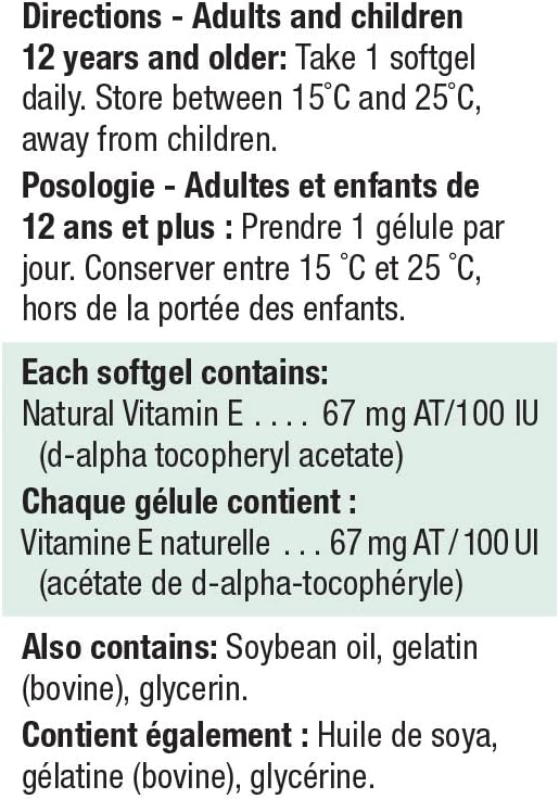 Jamieson 維生素 E 100 IU 是一種低效抗氧化劑。維生素 E 有助於防止組織損傷,同時促進正常的紅血球生成。
