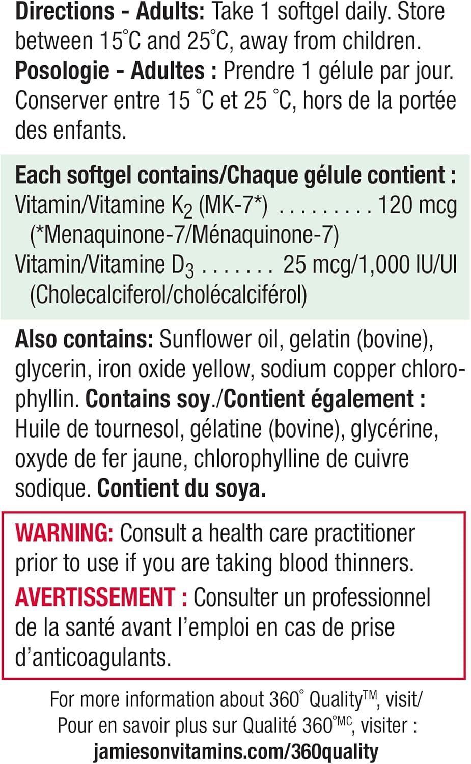 Jamieson 維生素 K 120 微克和維生素 D3 1,000 國際單位軟膠囊,支持免疫健康,強健骨骼和牙齒。非基因改造,無麩質,30 粒裝,加拿大製造