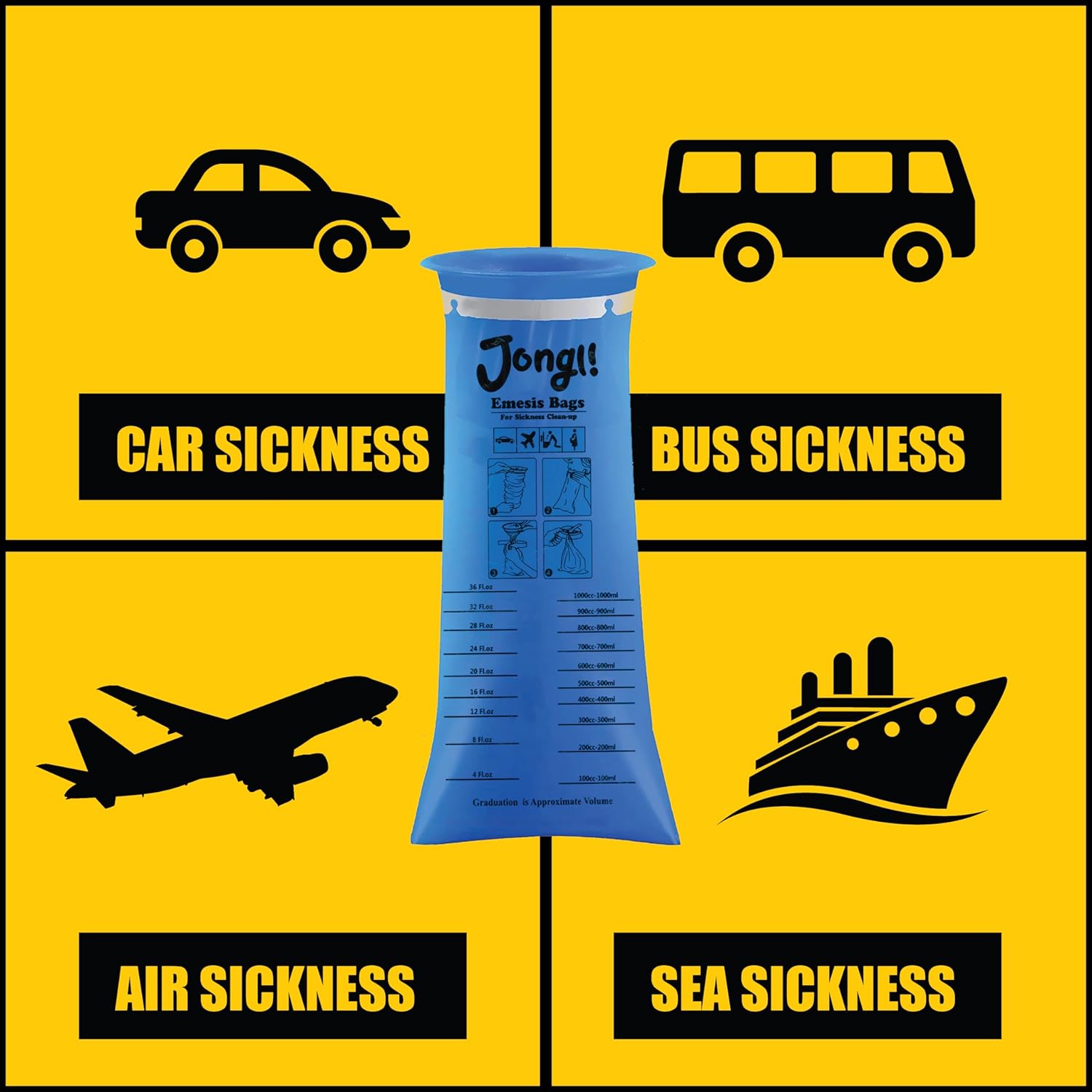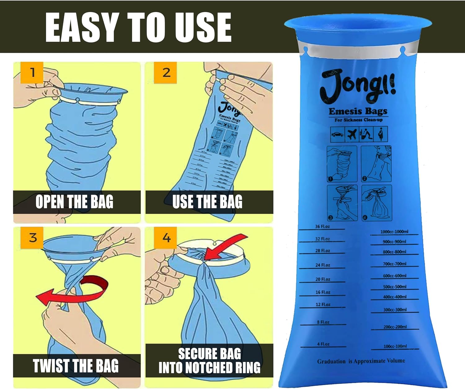 JONGLI 嘔吐袋非常適合駕車、公路旅行、飛機、露營、健行等場合使用,容量足以容納所有嘔吐物。這些嘔吐袋比其他品牌更厚實,接縫牢固,可防止洩漏和溢出。表面採用無毒 EVA 材質製成,柔軟安全。每包 24 個,非常適合家長、寵物主人、教師等使用。