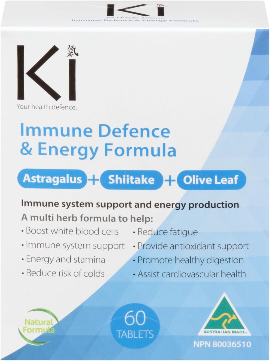 Ki免疫防禦與能量配方含有黃耆(一種常用的中藥材,用於增強免疫系統)和香菇(用於增強白血球)。橄欖葉也是一種強效草藥,有助於維持整體健康。
