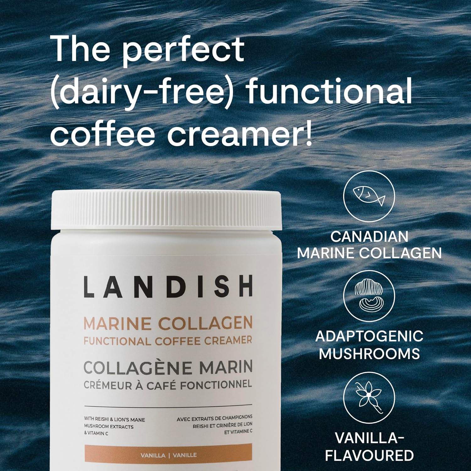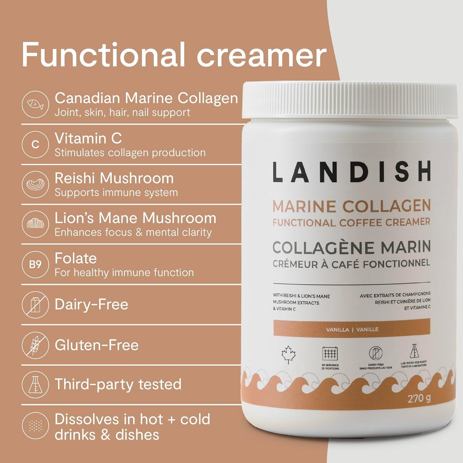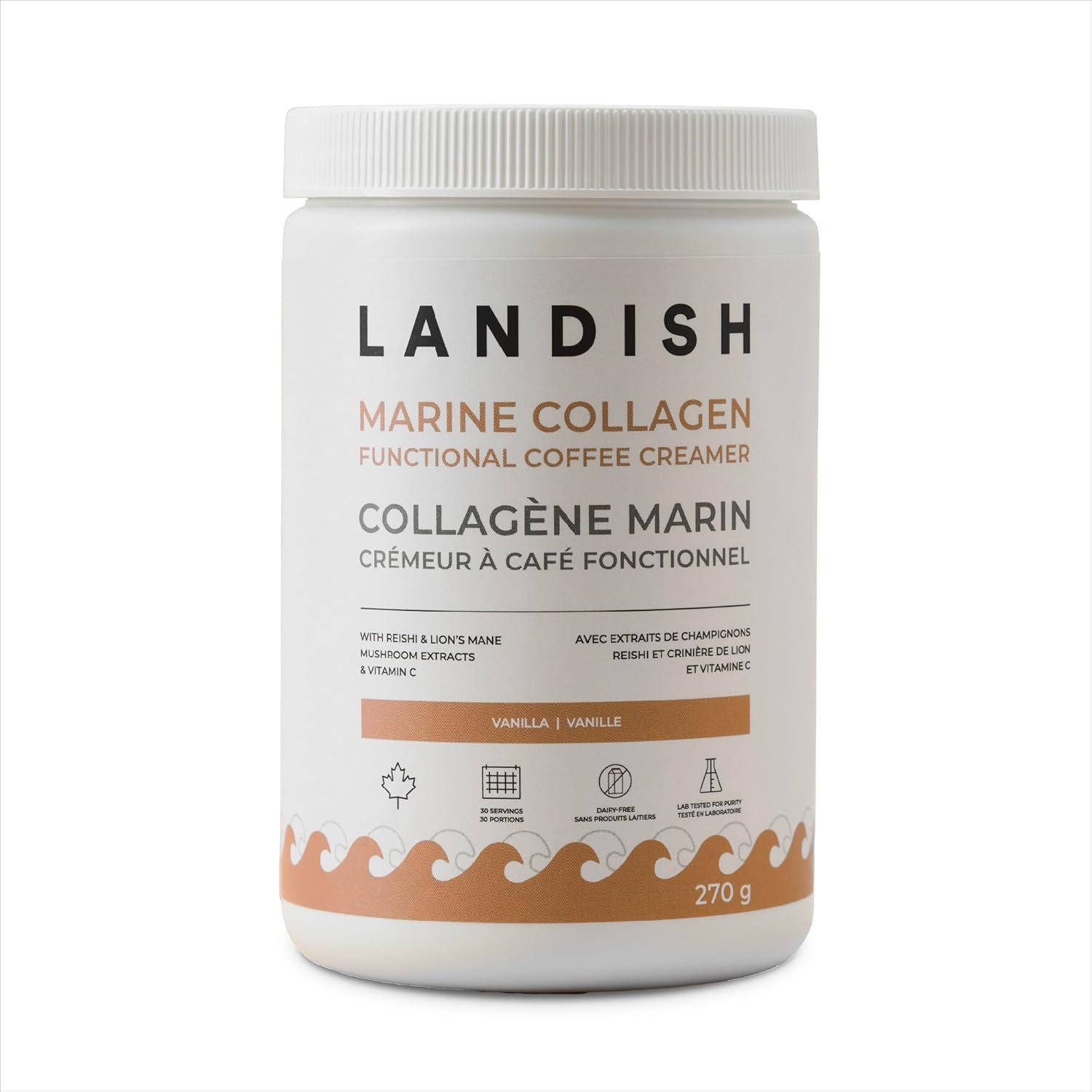 想要一款功效更強大的奶精? Landish 海洋膠原蛋白奶精是一款不含乳製品的混合奶精,旨在提升您的晨間咖啡、下午茶或任何需要提升功效的食譜的口感,並增添淡淡的香草香味。它融合了野生海洋膠原蛋白、有機靈芝和猴頭菇,以及富含維生素C和葉酸的西印度櫻桃果,為皮膚、頭髮、指甲、關節和免疫系統健康帶來一系列益處。奶精粉末可輕鬆溶於冷熱飲品中,使用起泡器可獲得更順滑、無結塊的體驗。本產品由加拿大 GMP 認證工廠生產,嚴格遵循良好生產規範,確保每批產品都擁有一流的品質。所有成分均經過第三方純度測試。不含激素和抗生素。準備好升級您的每日早晨護理了嗎?立即加入購物車,體驗 Landish 海洋膠原蛋白咖啡奶精的好處!