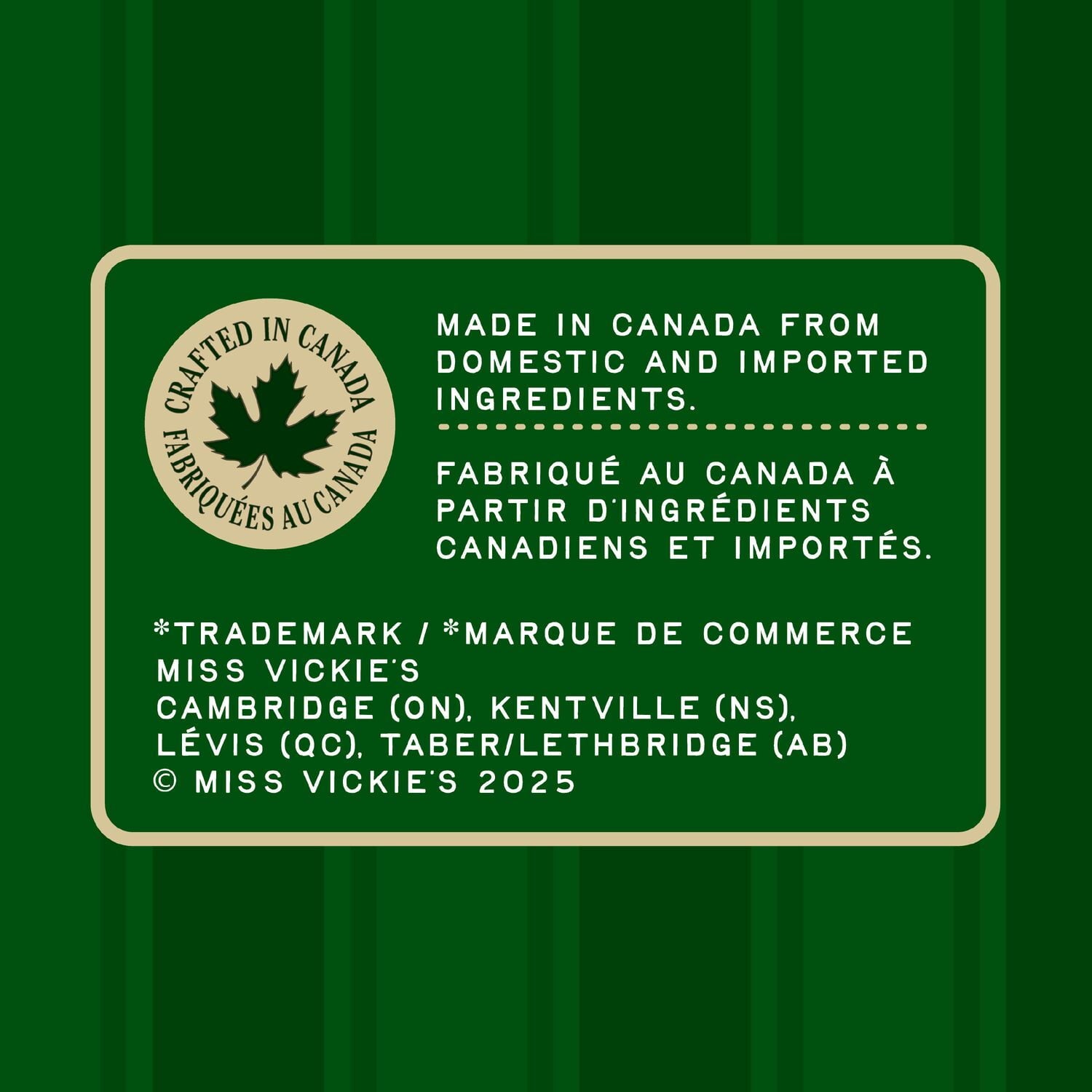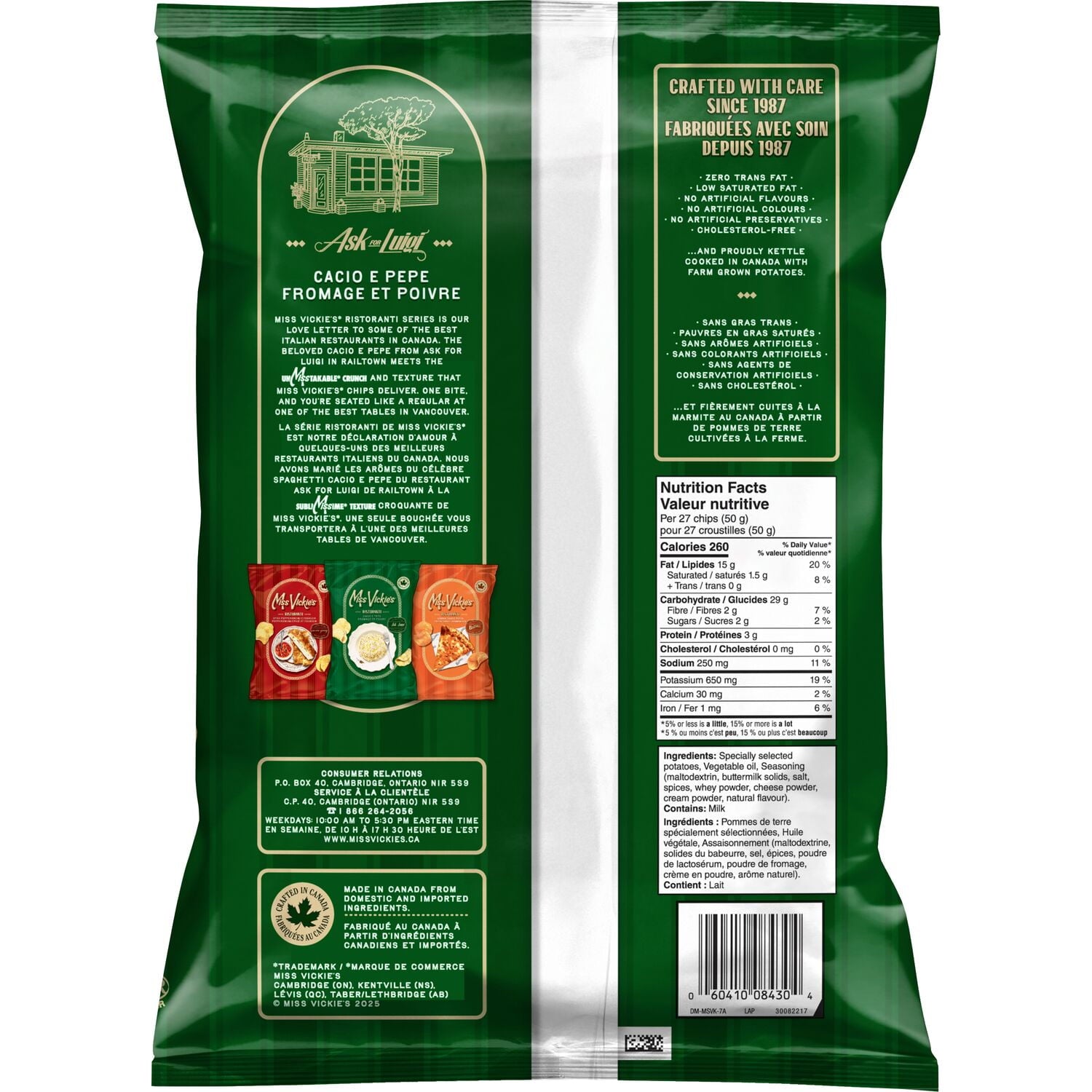 用 Miss Vickie's 的 Cacio e Pepe 口味鍋煮薯片,致敬加拿大頂級意大利餐廳。這款美味小吃融合了起司和胡椒的風味,以及 Miss Vickie 標誌性的酥脆口感。這些薯片不含反式脂肪,飽和脂肪含量低;不含人工香料、人工色素和人工防腐劑。它們不含膽固醇,並獲得了猶太潔食認證。來自 Miss Vickie's 限量版 Ristoranti 系列,以 Ask For Luigi 為主角。採用加拿大本土及進口原料精心製作。