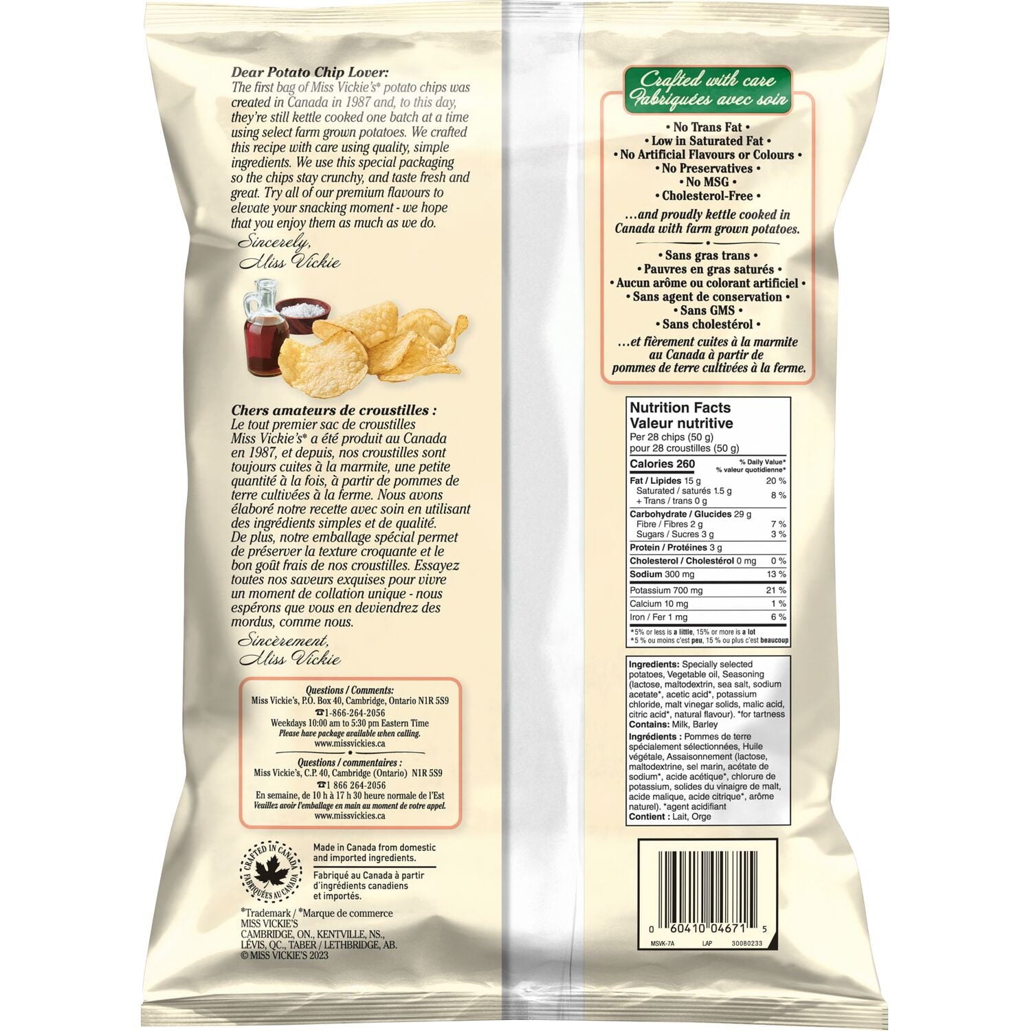Miss Vickie's 海鹽麥芽醋味鍋煮洋芋片每 50 公克不含反式脂肪、膽固醇,飽和脂肪含量低。不含人工香料或色素。不含防腐劑。哦,也不含味精。