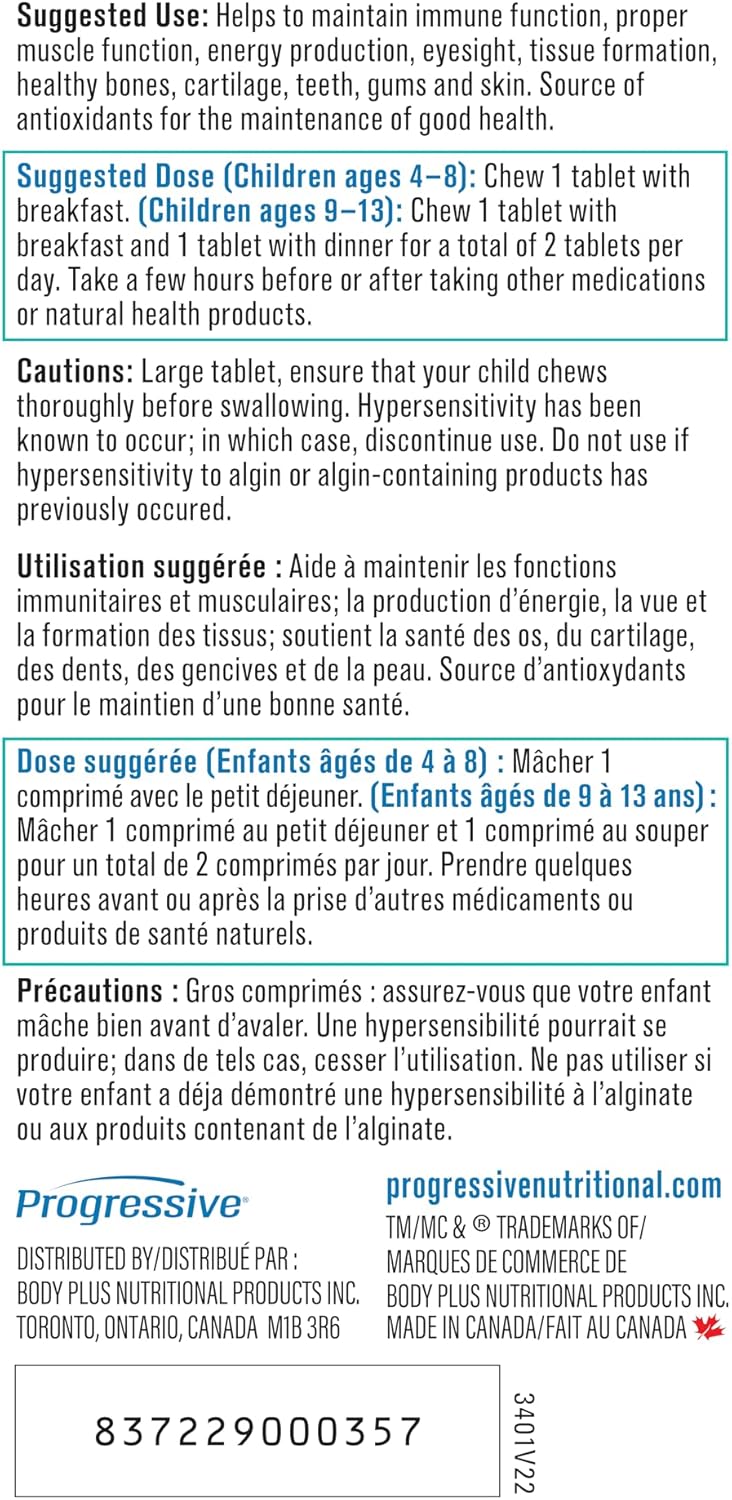 Progressive 兒童複合維生素提供全方位營養,滿足您孩子的需求,從而支持其健康成長和發育。給孩子服用兒童複合維生素,有助於促進其身體和智力發育,並增強免疫力。成分包括蔬菜和綠色食品、全果濃縮物、礦物質檸檬酸鹽、維生素D3、亞麻籽和DHA。注意:本產品為大片,請確保您的孩子在吞嚥前充分咀嚼。已知本產品可能導致過敏反應;若有過敏反應,請停止使用。如果您之前對藻酸鹽或含藻酸鹽的產品有過敏反應,請勿使用。