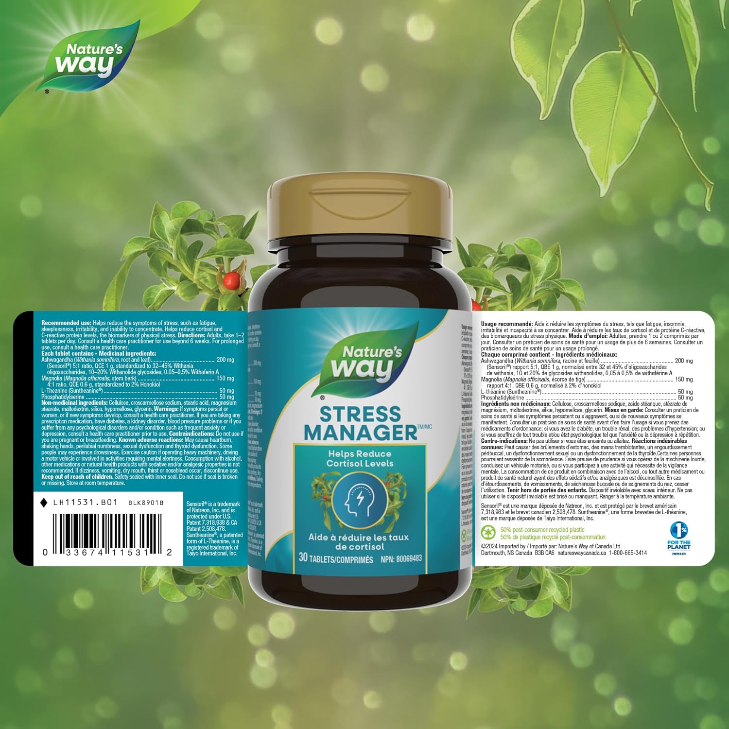 Nature’s Way 壓力管理產品是一款經臨床驗證的天然健康產品,旨在幫助您緩解壓力症狀,例如疲勞、失眠、煩躁和注意力不集中。每片素食錠劑含有 200 毫克 Sensoril® 南非醉茄、150 毫克厚朴、50 毫克 L-茶氨酸和 50 毫克磷脂酰絲氨酸。這種獨特的配方有助於降低皮質醇和 C 反應蛋白(生理壓力的生物標記)的水平。壓力管理產品適合素食者,採用經過品質檢驗的原料製成。成人每天只需服用 1-2 片即可作為日常保健的一部分。 Nature’s Way 致力於環保責任,其包裝瓶 50% 採用消費後再生塑膠製成。經加拿大衛生部授權(NPN:80069483)。對於那些尋求天然健康產品來緩解壓力的人來說,壓力管理產品是值得信賴的選擇。