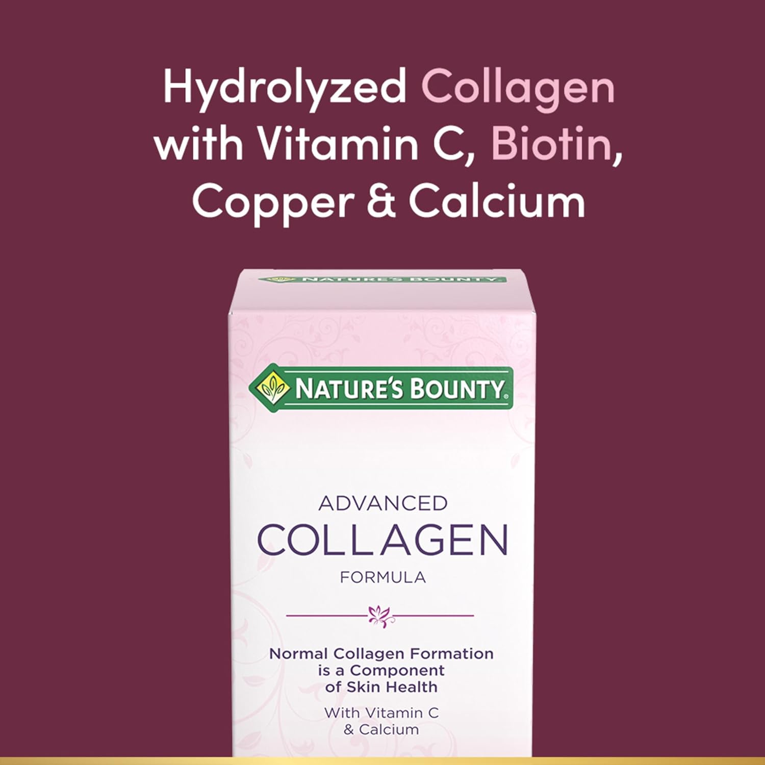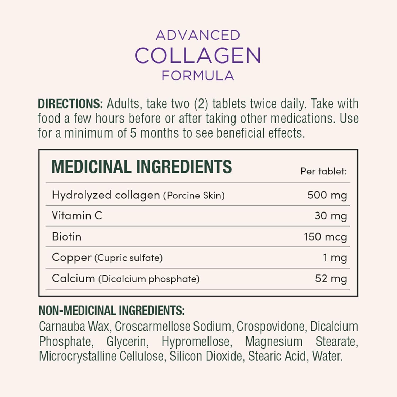 40多年來,NATURE'S BOUNTY 始終以您為中心,研發維生素和營養補充品。您服用維生素是為了幫助身體保持最佳狀態——那麼,何必糾結於其他維生素品牌呢?今天就來試試 NATURE'S BOUNTY 吧! NATURE'S BOUNTY 高級膠原蛋白配方有助於膠原蛋白的形成,從而維持健康的骨骼、軟骨、牙齒和牙齦。它還有助於維持健康的皮膚,生成和修復結締組織,並生成紅血球。此外,它還有助於增強免疫功能,是一種有助於維持身體健康的抗氧化劑。每片含有 500 毫克水解膠原蛋白(豬皮)、30 毫克維生素 C、150 微克生物素、1 毫克銅和 52 毫克鈣。成人每日兩次,每次兩 (2) 片。服用其他藥物前或服用後幾小時隨餐服用。至少服用 5 個月才能看到效果。