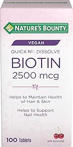 40 多年來,NATURE'S BOUNTY 始終以您為中心,研發維生素和營養補充品。您服用維生素是為了幫助身體保持最佳狀態——那麼,何必糾結於其他品牌的維生素呢?立即試用 NATURE'S BOUNTY。 NATURE'S BOUNTY 速溶生物素有助於維持頭髮和皮膚健康,並有助於維護指甲健康。生物素是維持身體健康的因素,它也有助於維持身體代謝營養素的能力。這款櫻桃口味純素速溶片含有 2500 微克生物素以及交聯聚維酮、硬脂酸鎂、甘露醇、天然櫻桃香精、硬脂酸和三氯蔗糖。成人每日服用一 (1) 片。將片劑放在舌下 30 秒後吞服。如需超過 4 週的使用,請諮詢保健醫師。