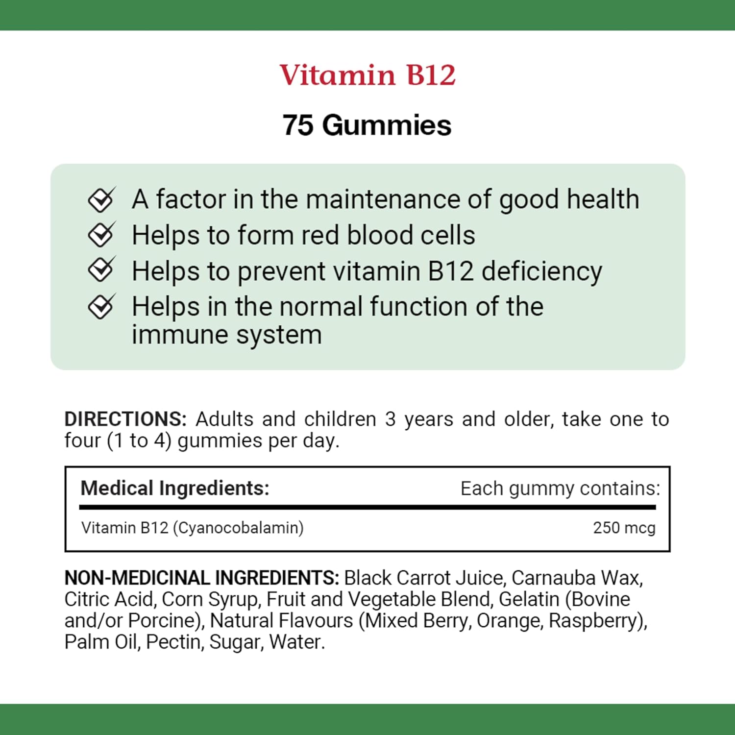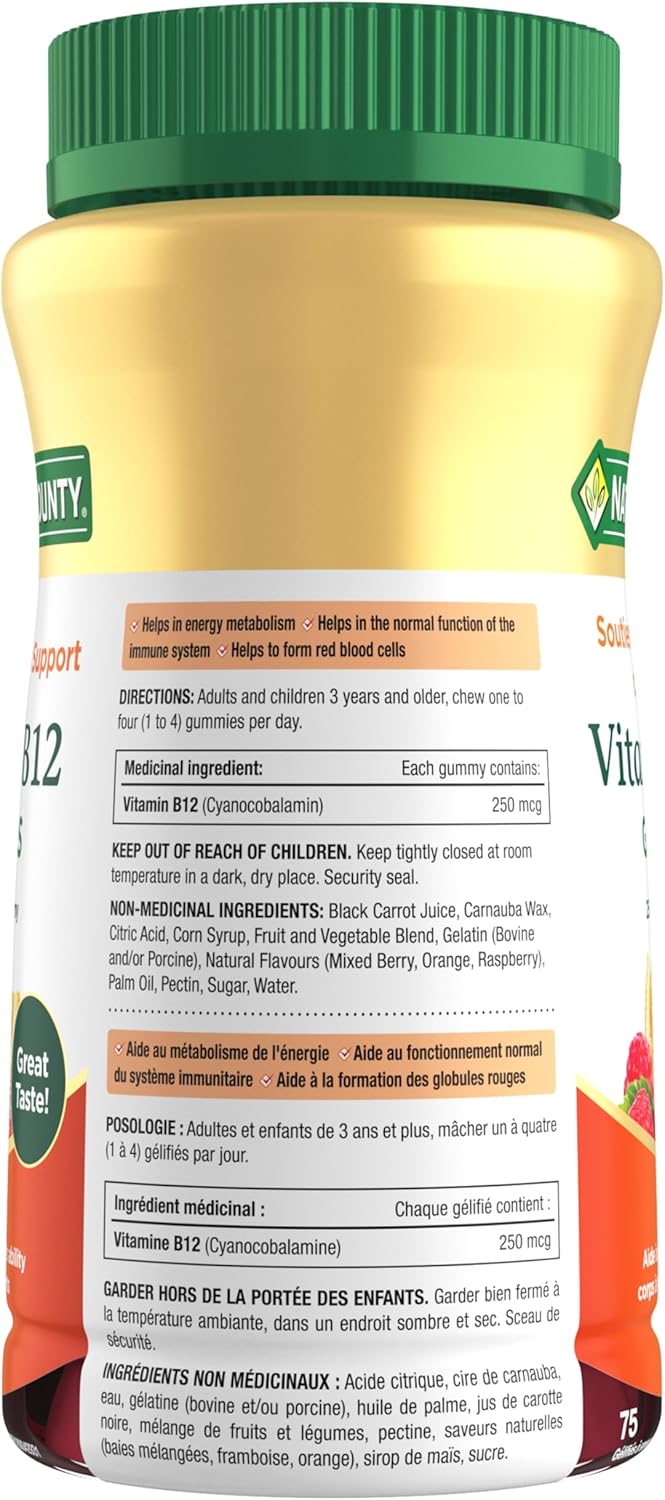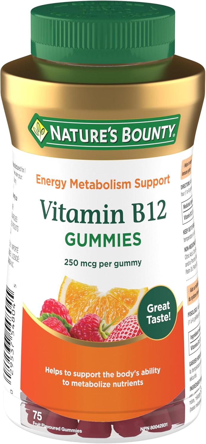 40多年來,NATURE'S BOUNTY 一直以您為中心,研發維生素和營養補充品。您服用維生素是因為想幫助身體保持最佳狀態——那麼,何必糾結於其他維生素品牌呢?今天就來試試 NATURE'S BOUNTY 吧! NATURE'S BOUNTY 維生素B12 是維持身體健康的重要因素。此外,它還能幫助形成紅血球,維護免疫系統的正常功能,並有助於預防維生素B12缺乏症。每粒易服用的軟糖含有250微克維生素B12,以及黑胡蘿蔔汁、巴西棕櫚蠟、檸檬酸、玉米糖漿、蔬果混合物、明膠(牛明膠和/或豬明膠)、天然香料(混合莓果、柳橙、覆盆子)、棕櫚油、果膠、白砂糖和水。成人及3歲以上兒童,每日服用1至4粒(1至4粒)。
