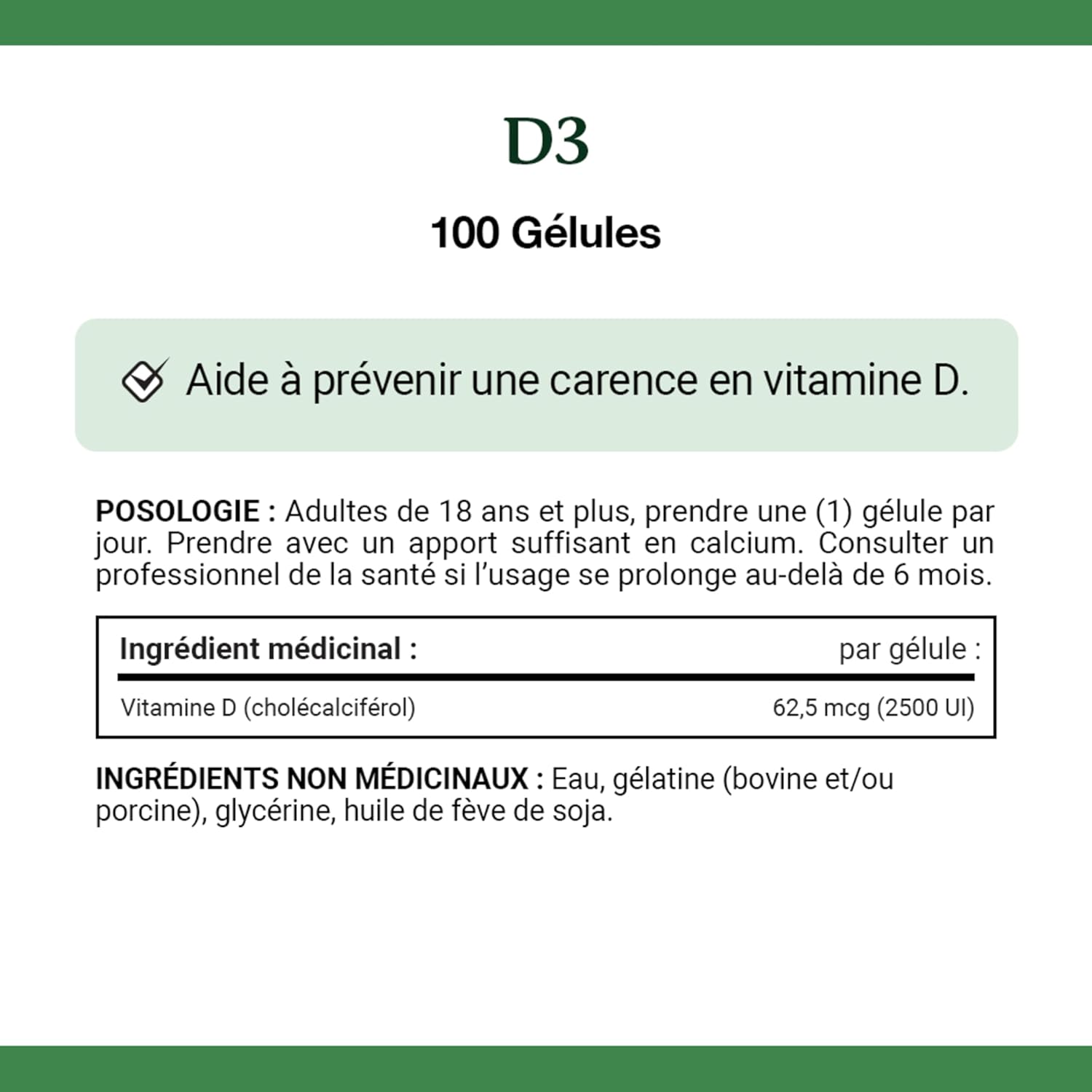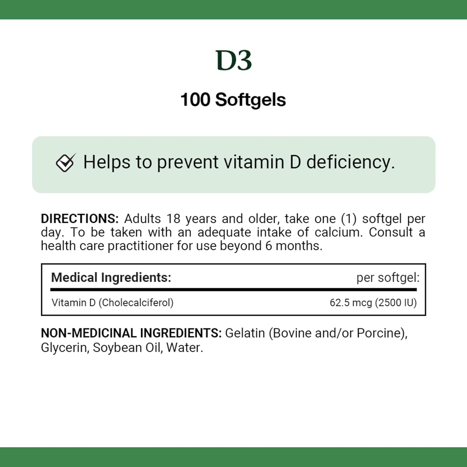 40 多年來,NATURE'S BOUNTY 始終以您為中心,研發維生素和營養補充品。您服用維生素是為了幫助身體保持最佳狀態—何必糾結於其他品牌的維生素?立即試用 NATURE'S BOUNTY。 NATURE'S BOUNTY 維生素 D3 有助於預防維生素 D 缺乏症。每粒軟膠囊含有 2500 國際單位維生素 D,以及明膠(牛和/或豬)、甘油、大豆油和水。 18 歲以上成人每日服用一 (1) 粒軟膠囊。請與足量鈣攝取量同時服用。 6 個月後繼續服用,請諮詢醫生。