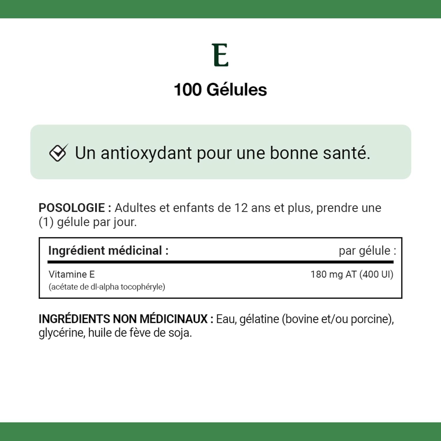 40 多年來,NATURE'S BOUNTY 始終以您為中心,研發維生素和營養補充品。您服用維生素是為了幫助身體保持最佳狀態——那麼,何必糾結於其他維生素品牌呢?今天就來試試 NATURE'S BOUNTY 吧!維生素 E 是維持健康的重要因子。 NATURE'S BOUNTY 維生素 E 軟膠囊富含抗氧化劑,有助於整體健康,每粒軟膠囊含有 400 國際單位維生素 E。這款不含防腐劑的維生素 E 軟膠囊含有明膠(牛和/或豬)、甘油、大豆油和水。成人及 12 歲以上兒童每日服用一 (1) 粒 NATURE'S BOUNTY 維生素 E 軟膠囊。