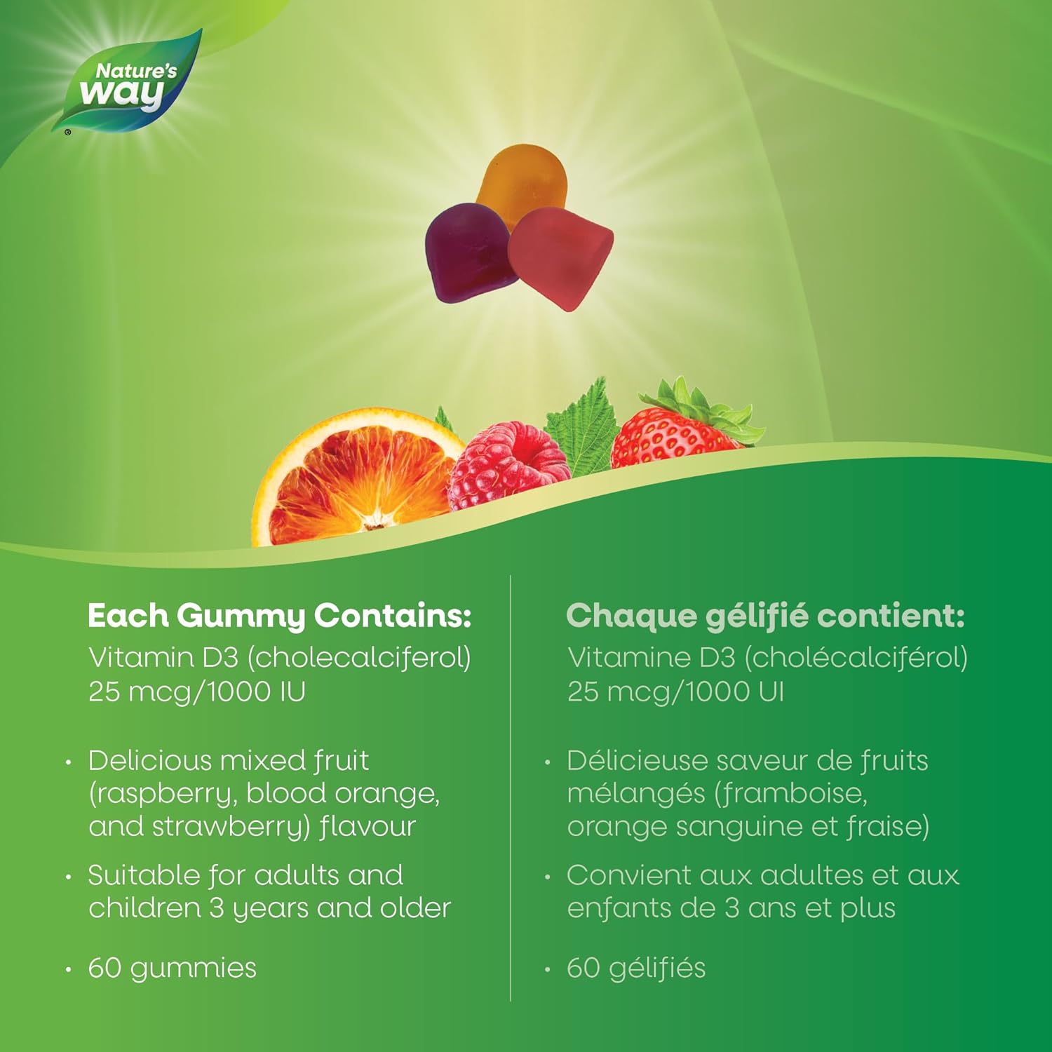 Nature's Way 維生素 D 軟糖 - 免疫和骨骼支持 - 每顆軟糖含 1000 IU 維生素 D3 - 草莓、桃子和芒果味軟糖 - 60 顆軟糖