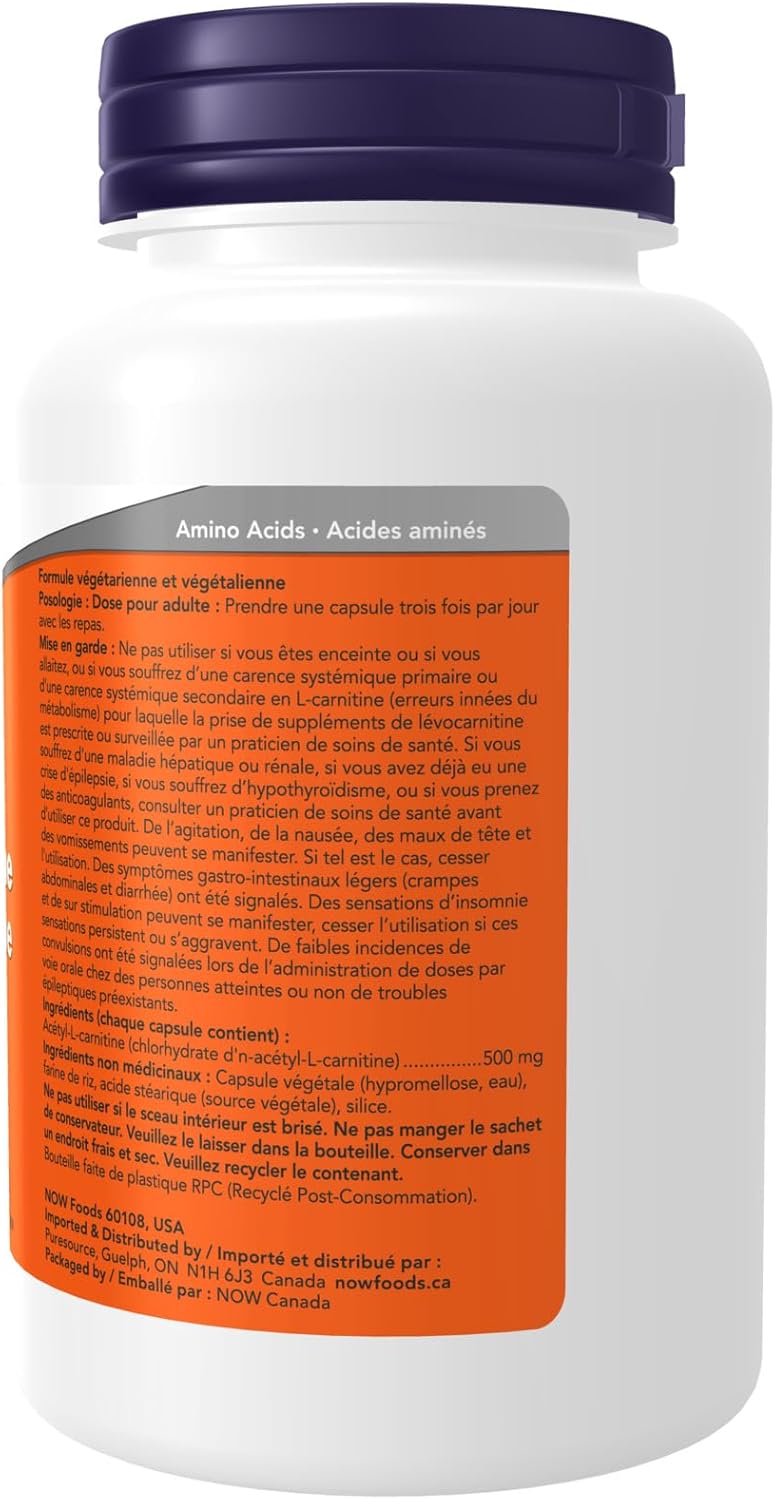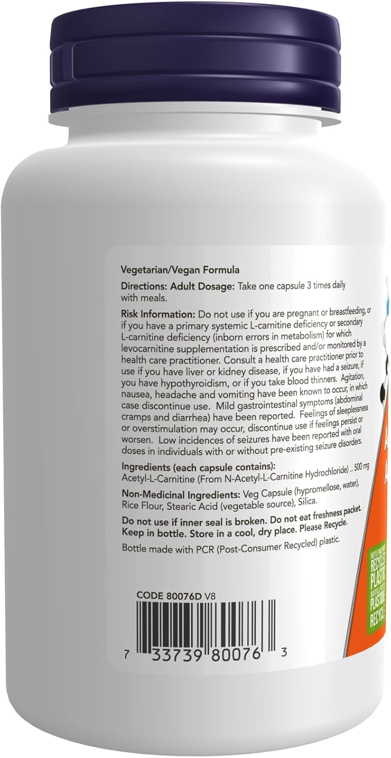 NOW Supplements, 乙醯左旋肉鹼 500 毫克,胺基酸,腦部和神經細胞功能,100 粒素食膠囊