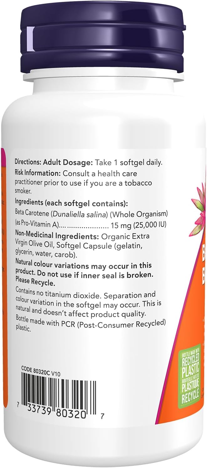 天然β-胡蘿蔔素含有額外的抗氧化類胡蘿蔔素,包括天然存在於D. Salina海藻中的α-胡蘿蔔素、玉米黃質、隱黃質和葉黃素。這種相關類胡蘿蔔素的天然平衡使該產品比常見的合成β-胡蘿蔔素具有更高的生物利用度。天然β-胡蘿蔔素是維生素A原的脂溶性食物來源。我們的NOW天然有機補充劑是確保您和您的家人獲得每日最佳健康所需的必需維生素、礦物質和營養素的有效方法。自2000年以來,NOW品牌一直致力於支持加拿大人,致力於提供能夠幫助人們過更健康生活的產品。加拿大70%的NOW產品在安大略省圭爾夫市生產或包裝,並僱用了來自全國各地的數百名加拿大員工。 NOW每月進行31,000次品質檢測,以確保您以最優惠的價格獲得最高品質的補充劑。我們承諾-標籤上的內容與瓶中的內容完全一致。