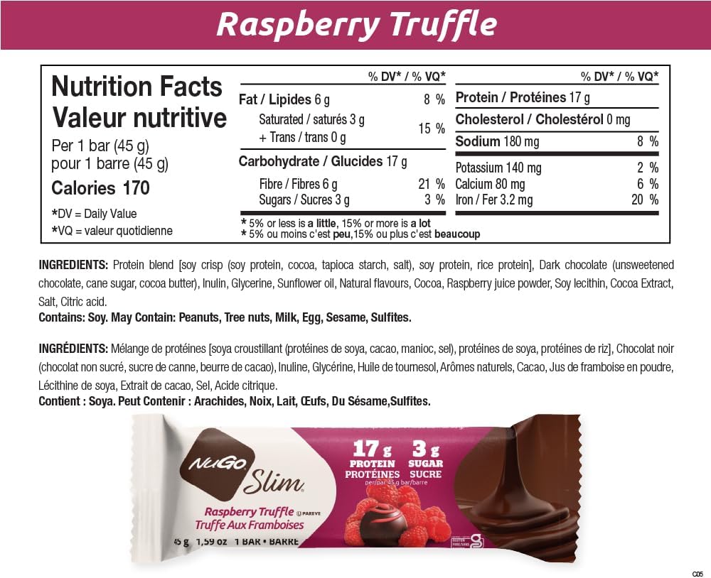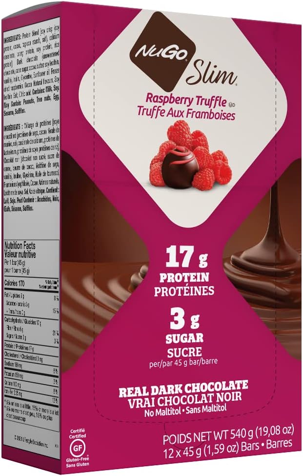 NuGo Slim 黑巧克力覆盆子鬆露,17 克蛋白質,3 克糖,6 克纖維,170 卡路里,低淨碳水化合物,無麩質,12 個 - (包裝可能有所不同)