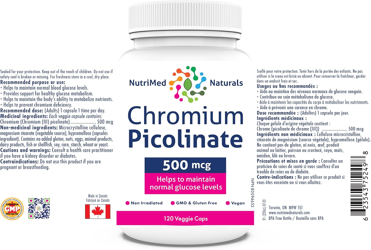 Nutrimed Naturals - 吡啶甲酸鉻 500mcg,120 粒膠囊,120 天用量 - 葡萄糖和血糖支持 - 肌肉質量和新陳代謝支持 - 經第三方測試 - 加拿大配製和製造