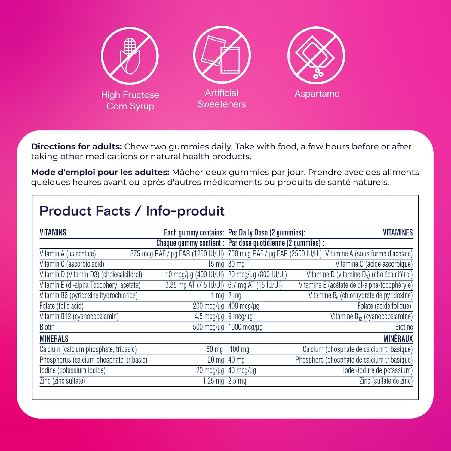 使用 One A Day's Multi+ 男女頭髮、指甲和皮膚維生素來支持您的健康和自然美麗。經過特殊配方的多種維生素,旨在提供日常營養支持,並支持健康的頭髮、皮膚和指甲。 One A Day Multi+ 頭髮、指甲和皮膚維生素含有多種必需維生素和礦物質,有助於支持:健康的皮膚和頭髮 - 保持健康的頭髮、皮膚和指甲骨骼健康 - 有助於骨骼和牙齒的發育和維護免疫健康 - 有助於維持免疫功能眼睛健康 - 有助於維持視力新陳代謝 - 有助於體內能量代謝抗氧化劑, E、生物素、鈣和鋅,One a Day's Multi+ 男女頭髮、皮膚、指甲維生素含有 12 種關鍵維生素和礦物質,製成美味的咀嚼軟糖。服用 One A Day 的 Multi+ 護髮、護膚、護甲維生素軟糖,讓您由內而外煥發光彩,感受最佳狀態。它富含生物素、鋅以及維生素 C 和 E,有助於維持健康肌膚。每顆軟糖都富含您所需的必需維生素和礦物質,有助於保持身體健康,同時不含高果糖玉米糖漿、阿斯巴甜和人工甜味劑。我們相信,健康是成就更好自我的關鍵。因此,我們堅持選用優質原料,並不斷更新配方,以反映最新的科學成果。不妨今天就將 One A Day Multi+ 護髮、保養、護甲軟糖融入您的健康生活方式!成人服用方法:每日咀嚼兩粒軟糖。與食物同服,服用其他藥物或天然保健品前或後數小時服用。為確保本產品適合您,請務必閱讀並遵循標籤上的指示。