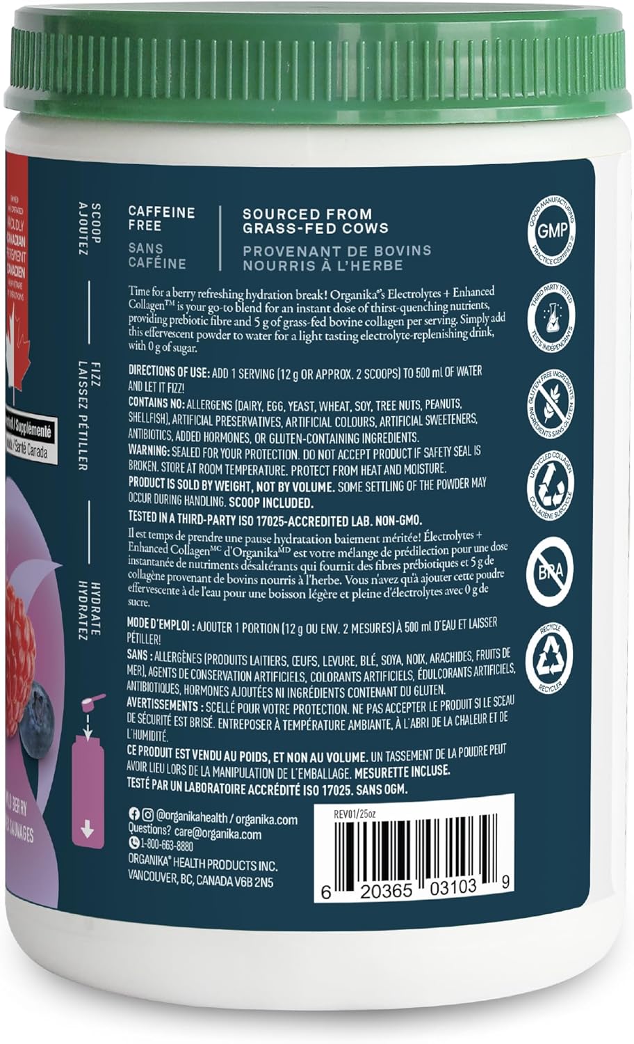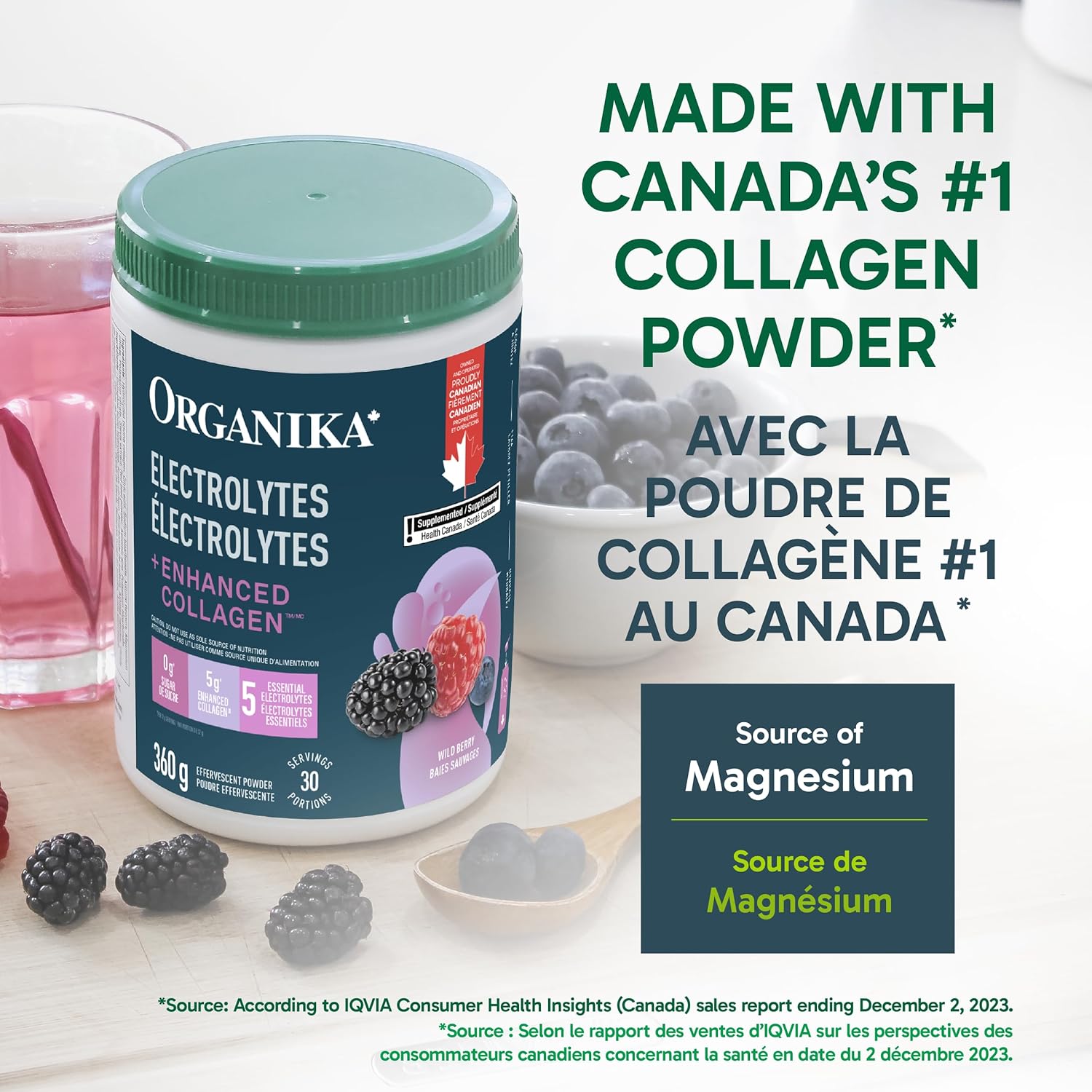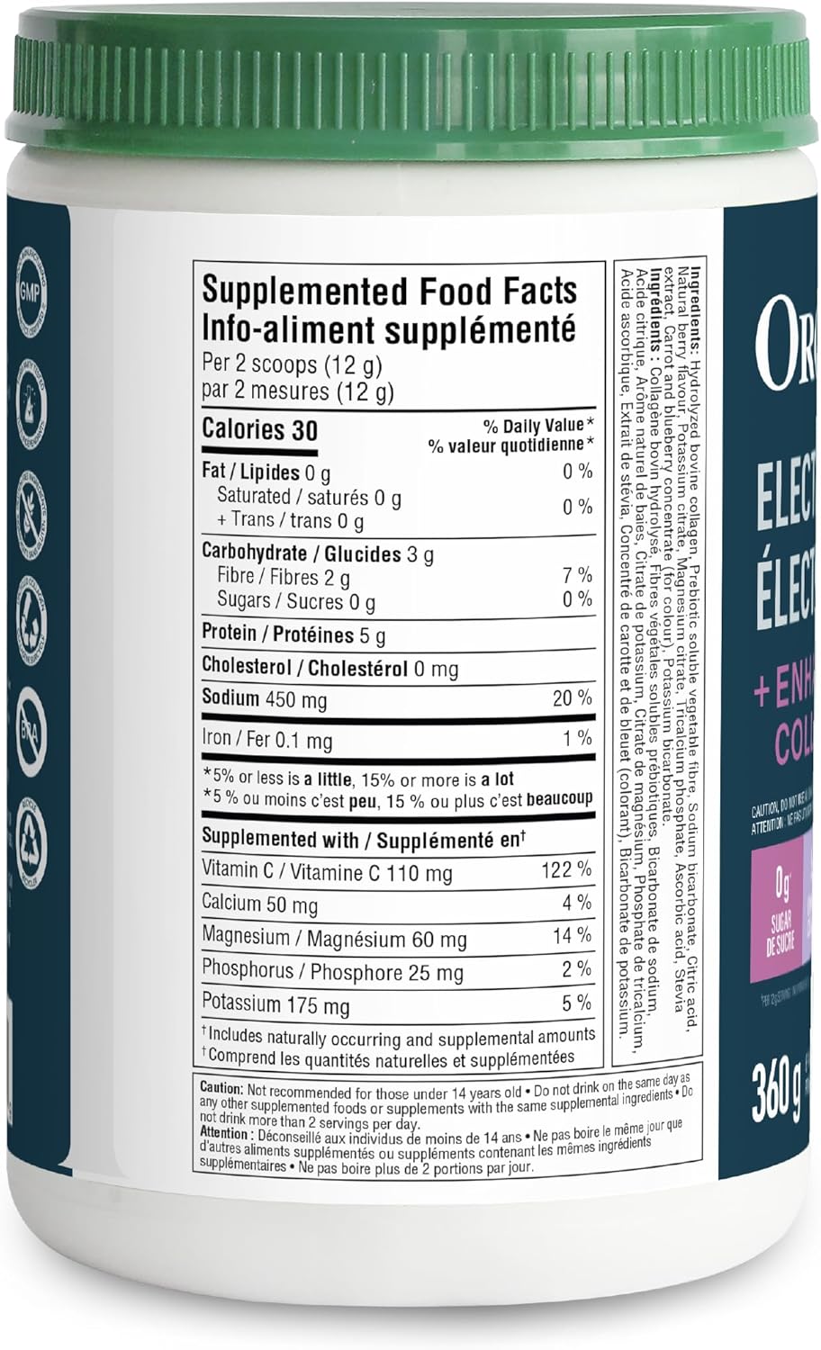 Organika 加拿大製造電解質 + 增強膠原蛋白 - 野莓口味 - 無糖補水 | 5 克蛋白質 + 100% 每日所需維生素 C | 360 克,30 份
