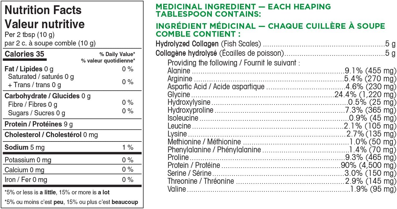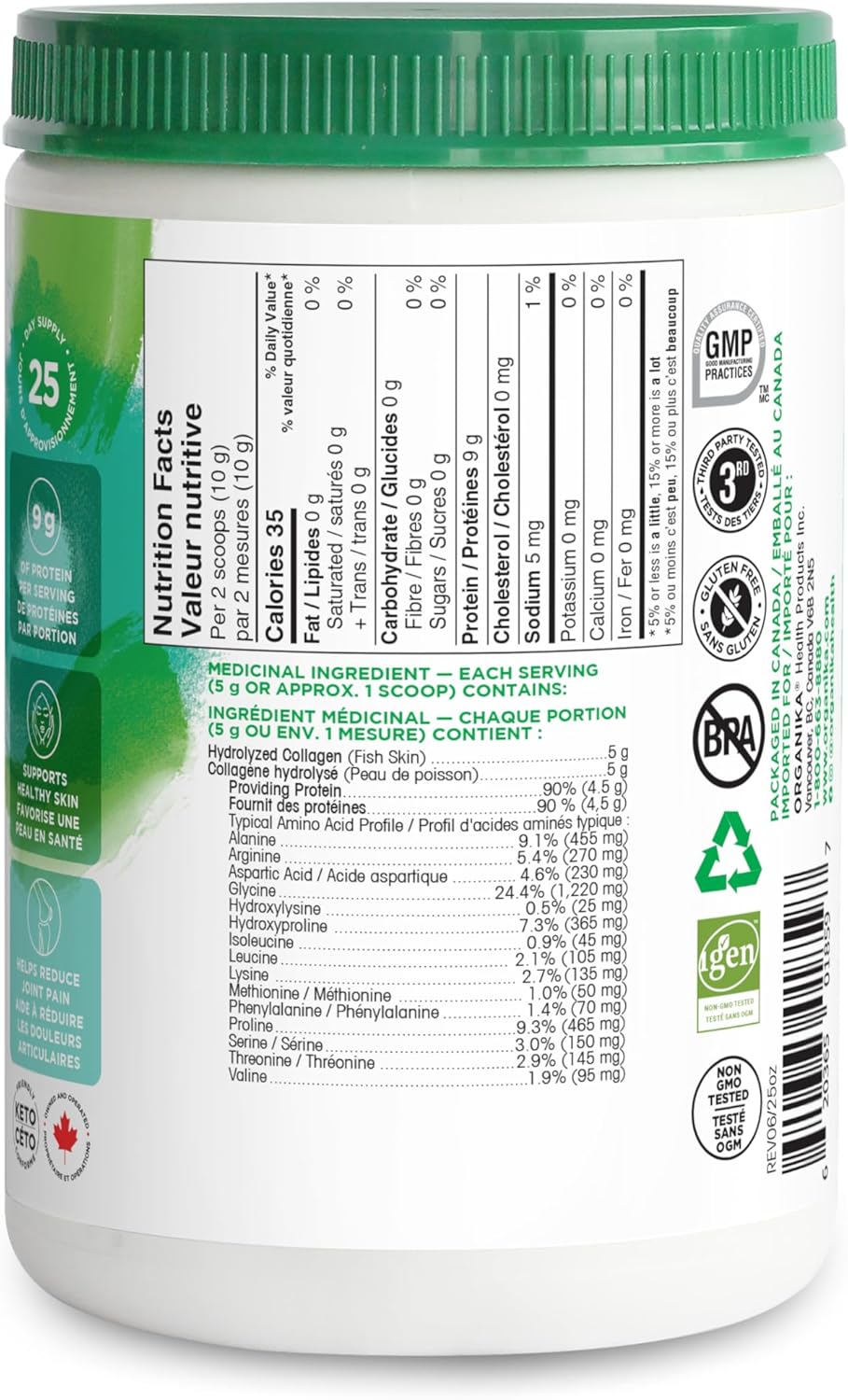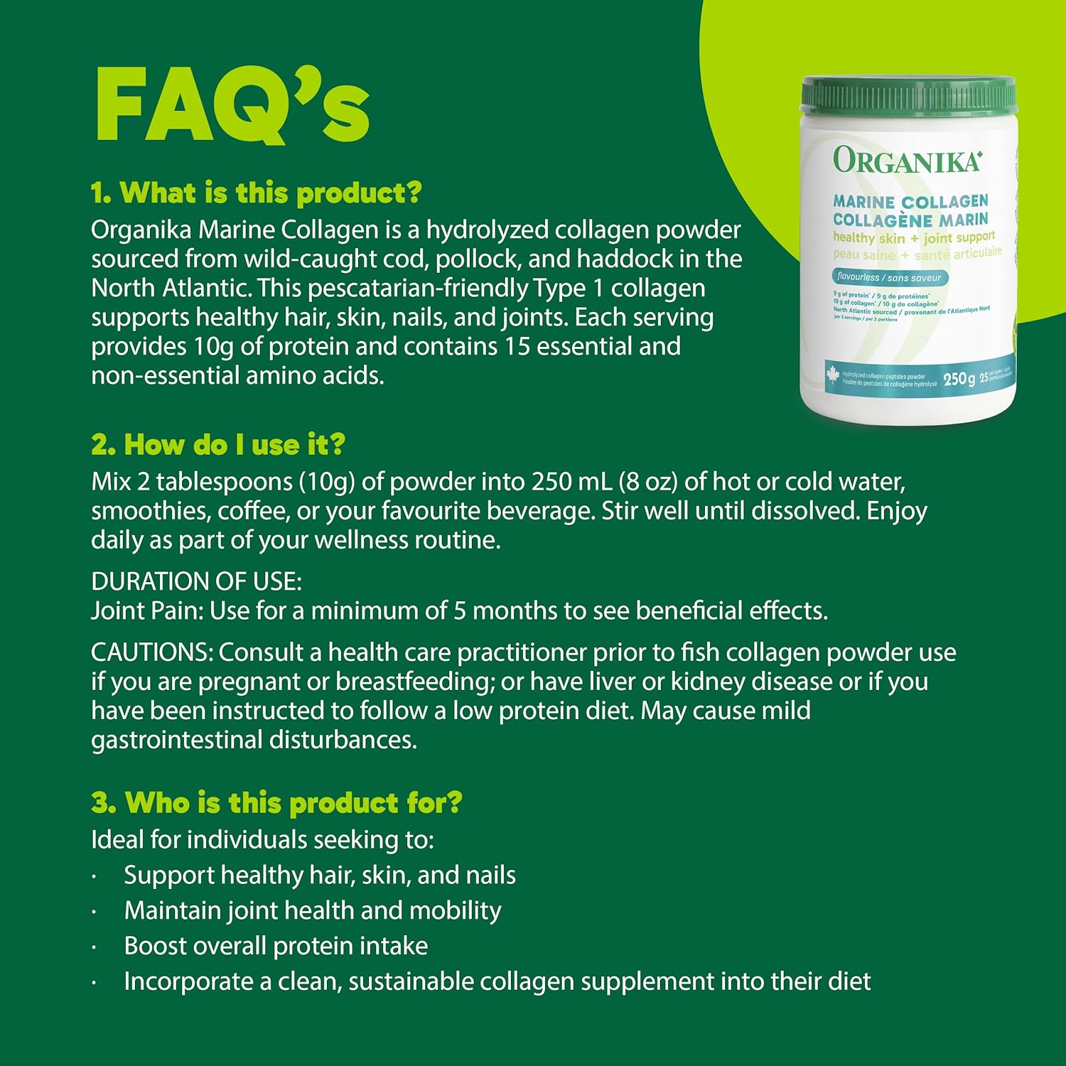 Organika 加拿大製造海洋膠原蛋白粉 - 北大西洋野生捕撈 - 9 克純水解膠原蛋白,有益於皮膚、頭髮、指甲和關節健康 - 無味,250 克