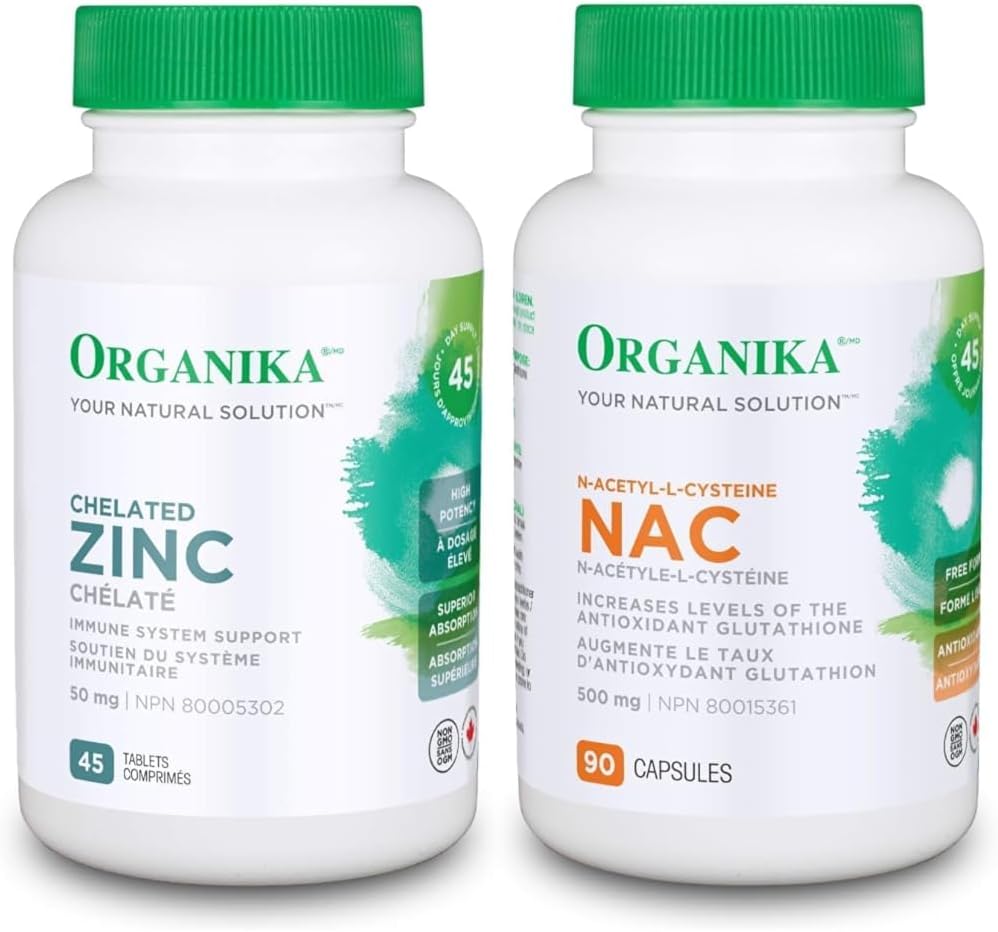 Organika 螯合鋅 45 片 & NAC(N-乙醯-L-半胱氨酸)500 毫克 - 支持抗氧化穀胱甘肽水平、免疫系統支持、肝臟和排毒支持 - 90 粒膠囊