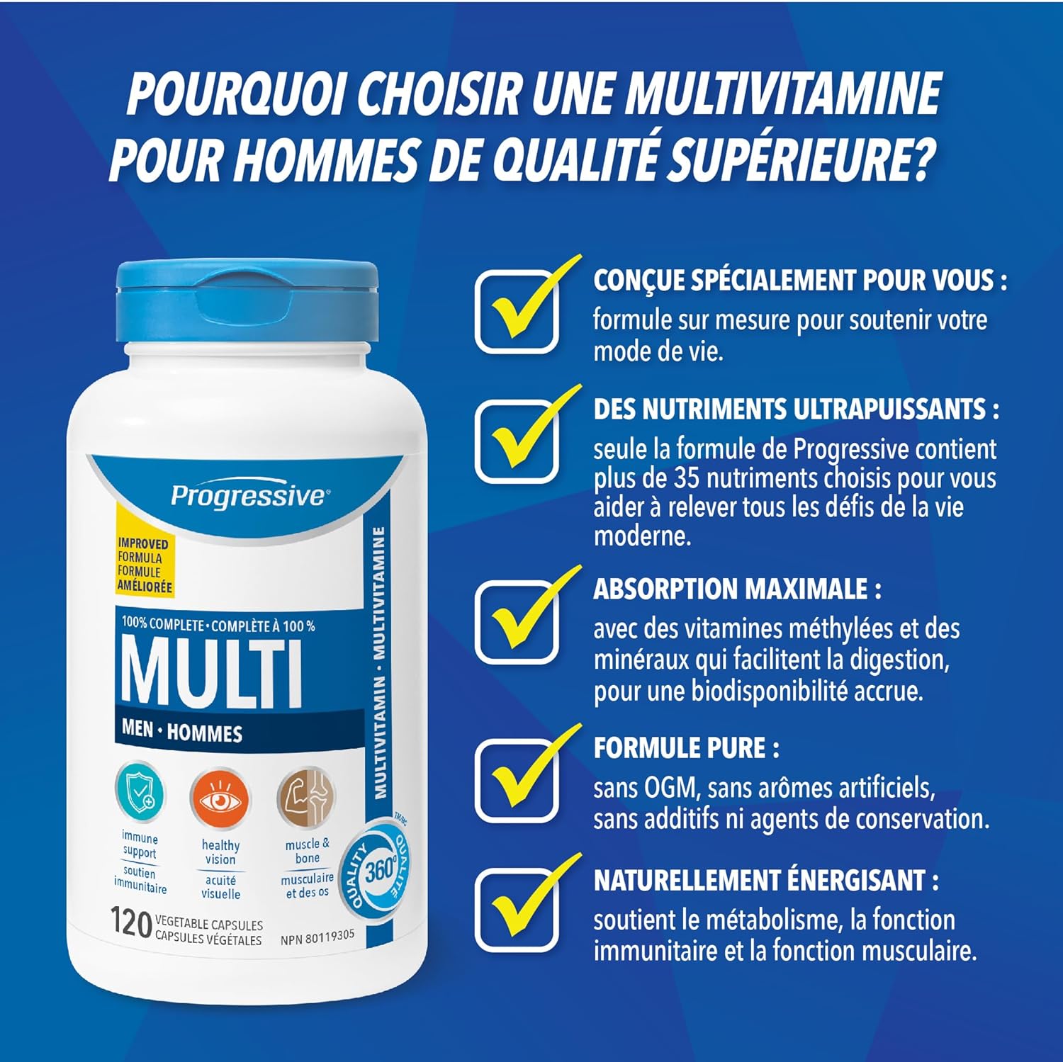 Progressive Advanced 成人男士每日複合維生素,含鋸棕櫚、胡蘆巴和瑪卡。支持免疫健康、提升能量、改善情緒,100% 完整配方,加拿大製造,120 粒裝