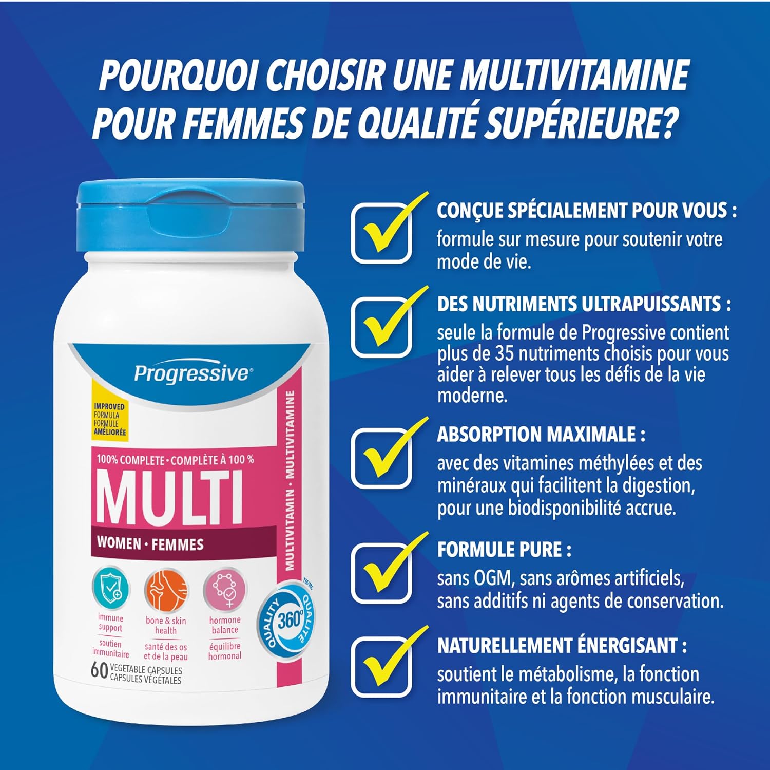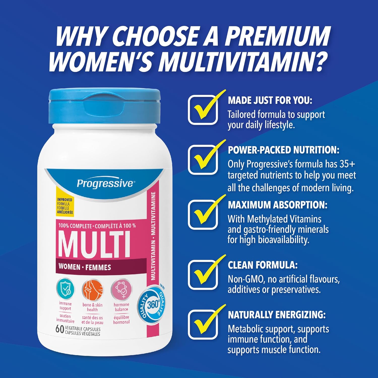 Progressive Advanced 成人女性每日複合維生素,含DIM、聖潔莓和瑪卡。支持免疫健康、能量和荷爾蒙健康,100% 完整配方,加拿大製造,60 粒裝