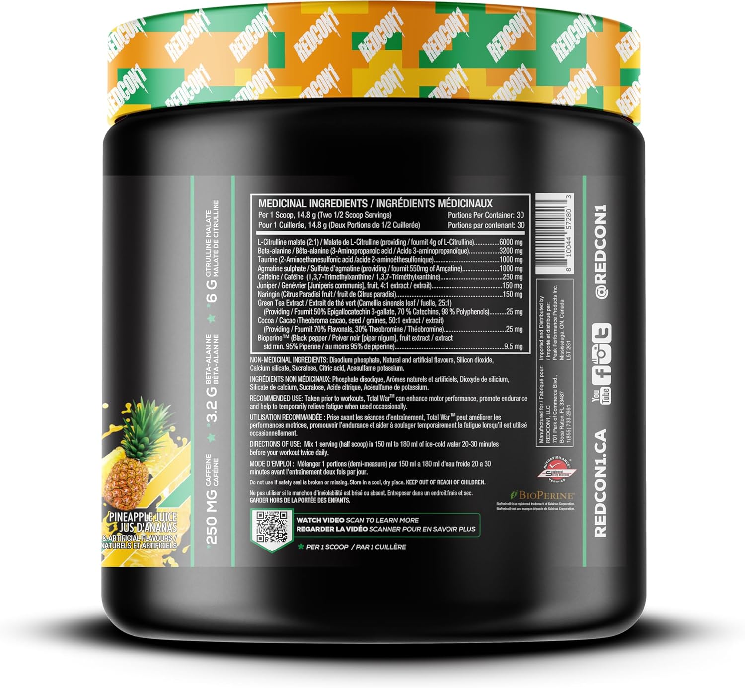 REDCON1 Total War 運動前粉,鳳梨汁 - β-丙氨酸 + 瓜氨酸蘋果酸,適合素食者和生酮飲食者,適合男性和女性,含 250 毫克咖啡因 - 速效 HMB(30 份)