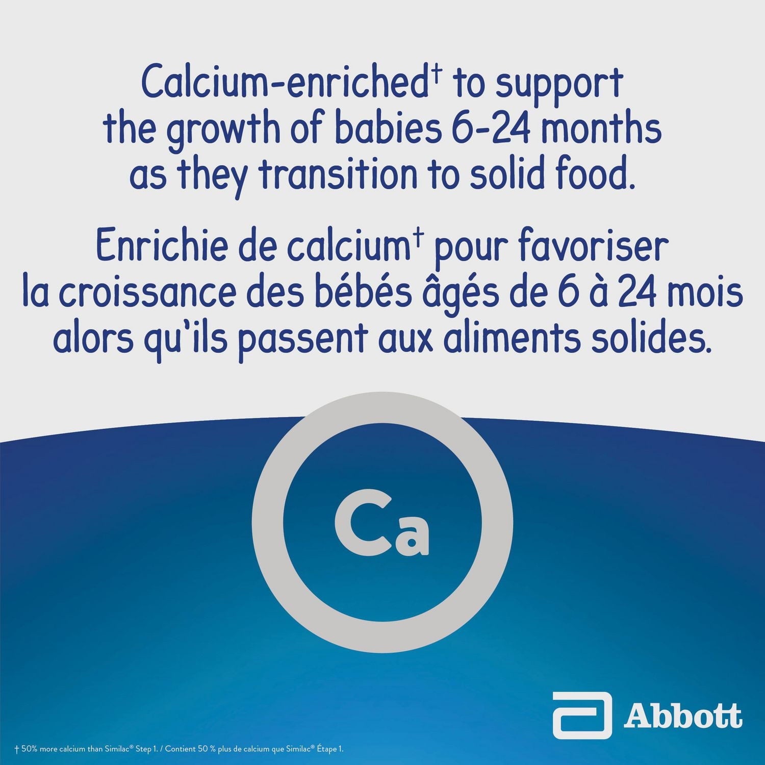 現在您的寶寶已經開始吃輔食了,很難判斷她是否攝取了足夠的營養。 Similac® Step 2 專為 6 至 24 個月大的寶寶設計,在她過渡到輔食(例如穀物、嬰兒食品和牛奶)的過程中,可以陪伴您和您的寶寶。在寶寶第一年的後半年,她快速生長的骨頭需要更多的鈣質。 Similac® Step 2 是一款富含鈣質(比 Similac® Step 1 含鈣更多)、強化鐵的嬰兒配方奶粉。這款易於消化的配方†將支持寶寶的正常生長發育。它也是非基因改造的,這意味著它不含任何基因工程成分,因此您可以放心地為寶寶餵食這款配方奶粉。 Similac® Step 2 提供方便舀取的罐裝奶粉和濃縮液體兩種形式。祝寶寶們幸福快樂!