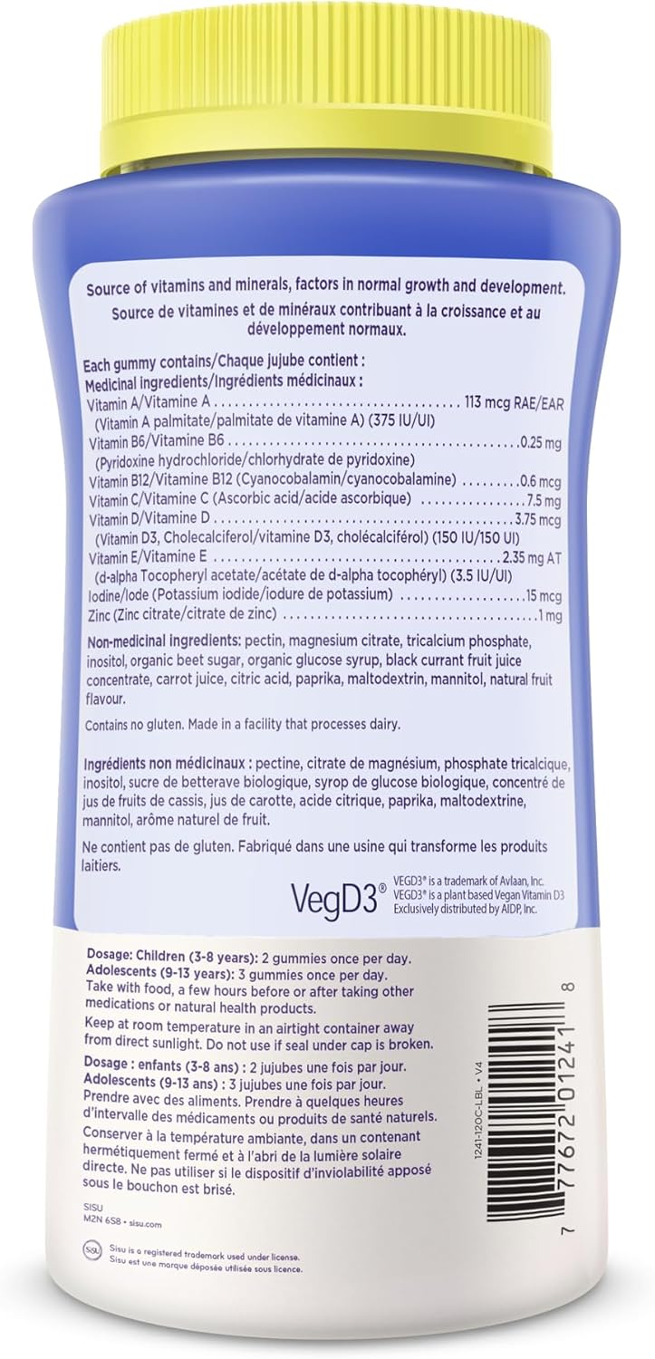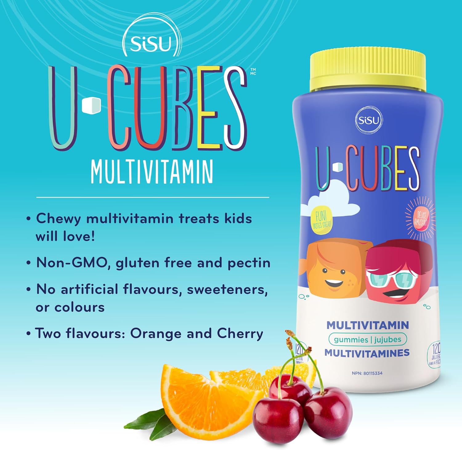 美味的 Sisu U-Cubes 軟糖採用耐嚼的每日配方,專為兒童成長中的身體和思維而設計,提供他們所需的重要維生素和礦物質。每瓶都含有適合兒童的葡萄、櫻桃和橙子口味,這些果膠基軟糖不含動物明膠、高果糖玉米糖漿或人工香料、甜味劑和色素。