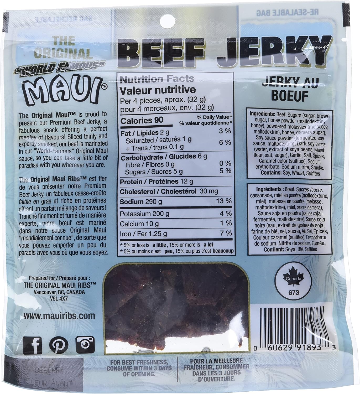 我們的優質牛肉乾是一道絕佳的小吃,帶來完美融合的風味!切成薄片,煙燻工藝精湛。浸泡在我們「舉世聞名」的茂宜島原味醬汁中,無論您身在何處,都能感受到這份天堂般的美味。