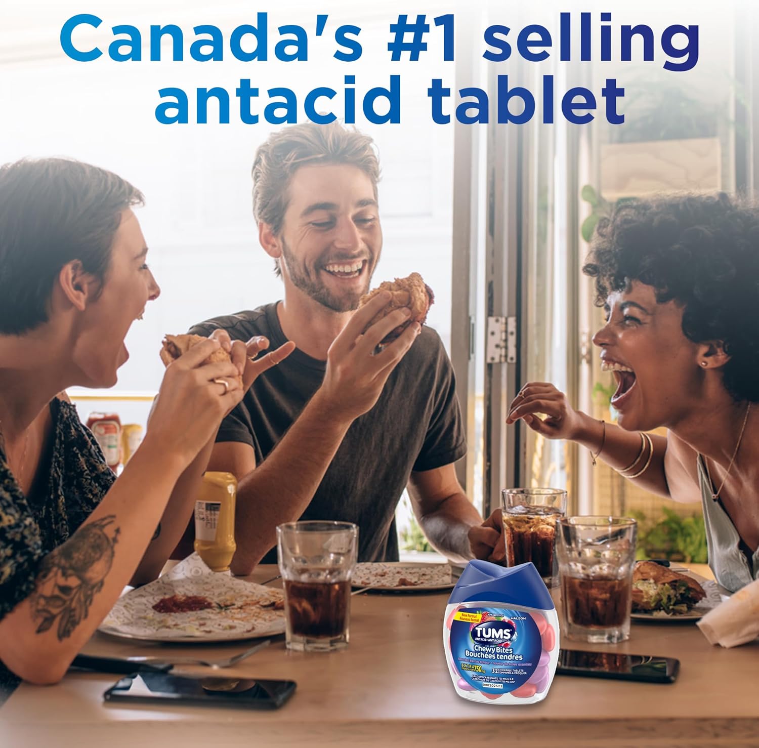 探索全新美味,獲得與TUMS相同的胃灼熱緩解效果! TUMS Chewy Bites擁有香脆可口的外殼和柔軟耐嚼的內餡。 TUMS Chewy Bites接觸胃酸後,幾秒鐘內即可發揮作用,中和胃酸。這款美味的莓果口味(草莓、覆盆子和混合莓果)抗酸咀嚼片可緩解胃酸過多引起的胃灼熱、消化不良和胃酸過多。 TUMS是加拿大銷售第一的抗酸片。