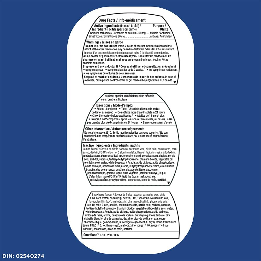 探索美味新方法,同時緩解胃灼熱和脹氣!全新TUMS胃脹舒緩咀嚼片,蘊含750毫克碳酸鈣,可在接觸胃酸後數秒內起效,中和胃酸,有效緩解胃灼熱、消化不良、胃酸過多和胃部不適等症狀。此外,它還添加了80毫克西甲矽油,可分解消化道中的氣泡,緩解脹氣引起的腹脹、腹壓和脹氣感。 TUMS胃脹舒緩咀嚼片外皮酥脆,內餡柔軟耐嚼,並有草莓和檸檬兩種口味可選。 TUMS是加拿大銷售第一的抗酸藥片。